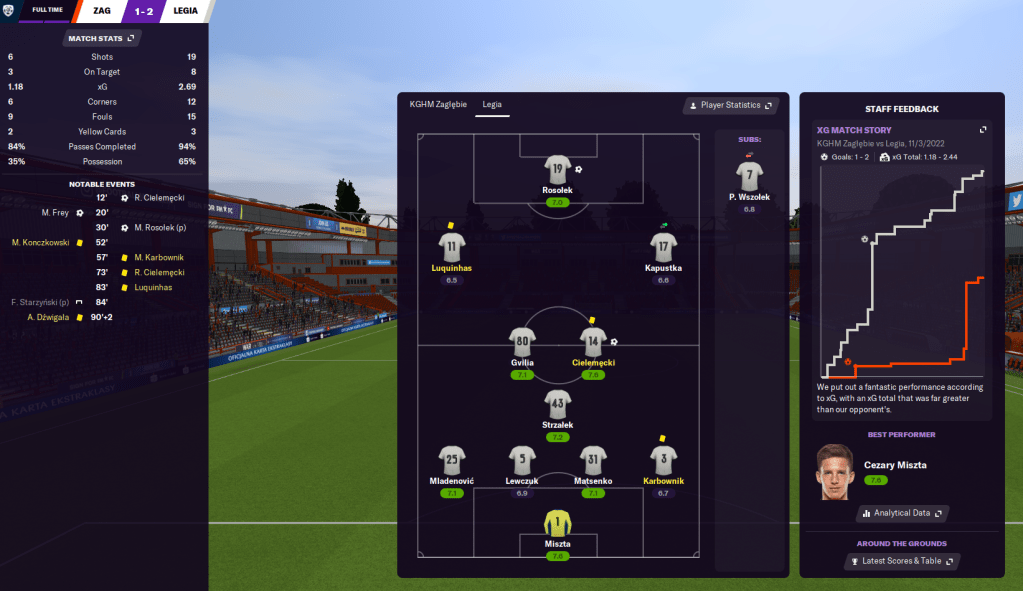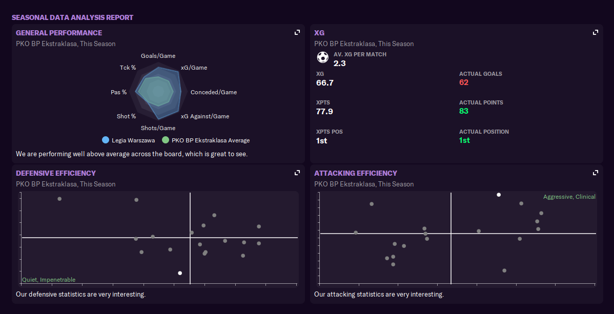 Other key players were left-back Filip Mladenovic, who averaged 7.41 with two goals and four assists, and Wszolek, who scored 14 goals in 32 games. While Gvilia had the most assists at the club with eight and Miszta kept 19 clean sheets. Legia’s 62 goals was less than the xG of 66.7 but amassed 83 points, which was higher than the xPts of 77.9.