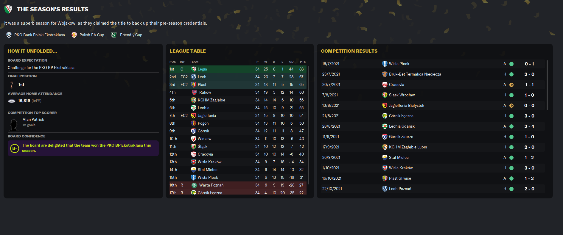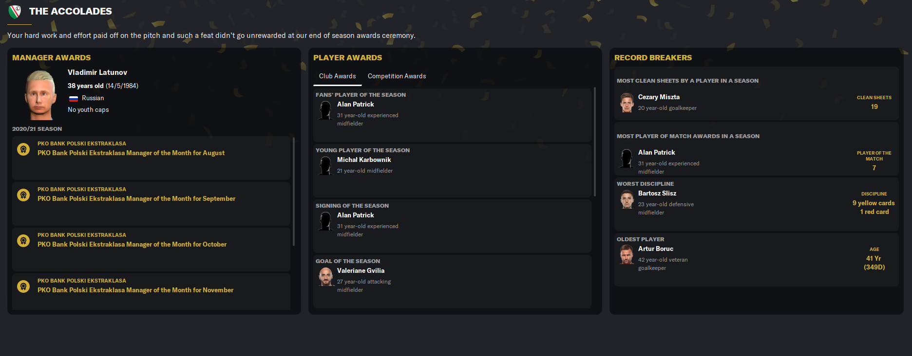 Alan Patrick finished as the top scorer in the league with 15 goals, despite missing the last nine matches through injury! He also won the Polski Ekstraklasa player of the season award, while on-loan right-back Michal Karbownik won the young player of the season.