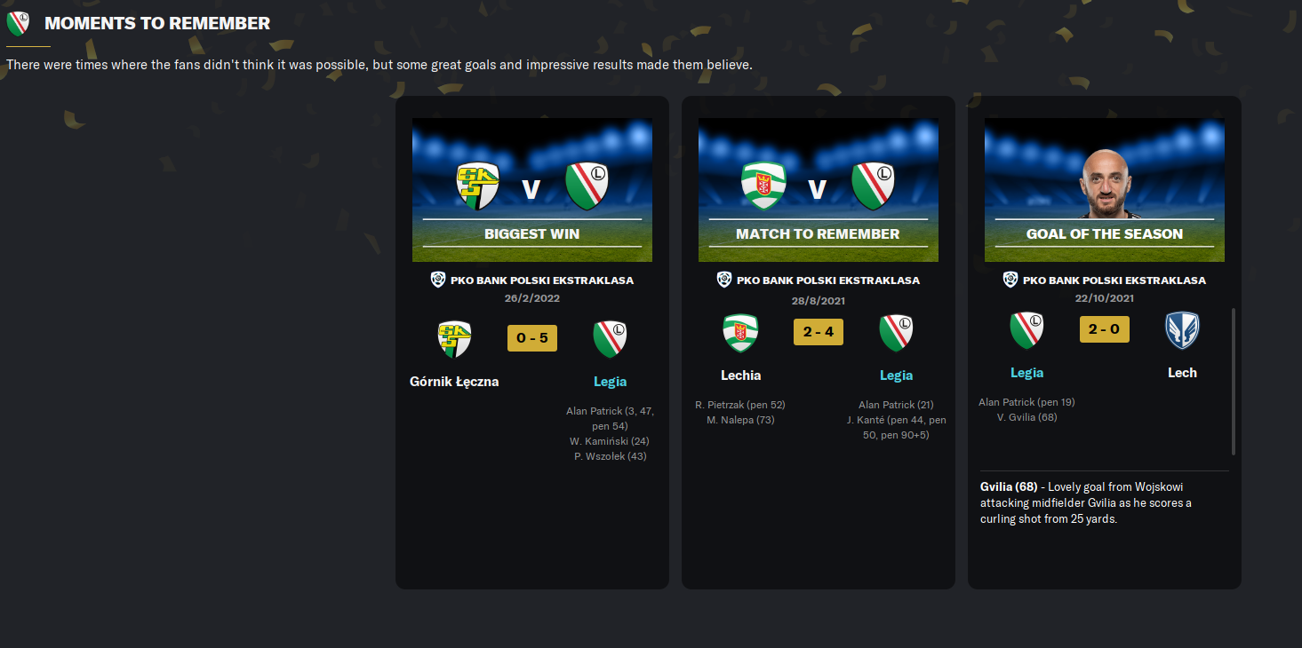 Alan Patrick finished the campaign as Legia’s top scorer and had by far the best average rating of 7.63 from 23 games, along with six assists. Latunov was thoroughly chuffed with the impact that his only cash signing had. He rightly won the fans’ player of the season and siging of the season and Karbownik won young player of the season.