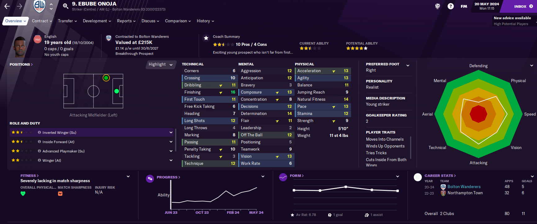 I’d just signed a new three-year deal at the club and things are starting to look fairly exciting for the future. This is mainly thanks to the raft of promising youngsters, which includes no fewer than 11 players with 4.5- or 5-star potential. The pick of those are Turner, Latapy and Onoja, but I think there’s plenty more young Trotters Talent to join them in the first-team soon, including this year’s academy product star Nana Martin.