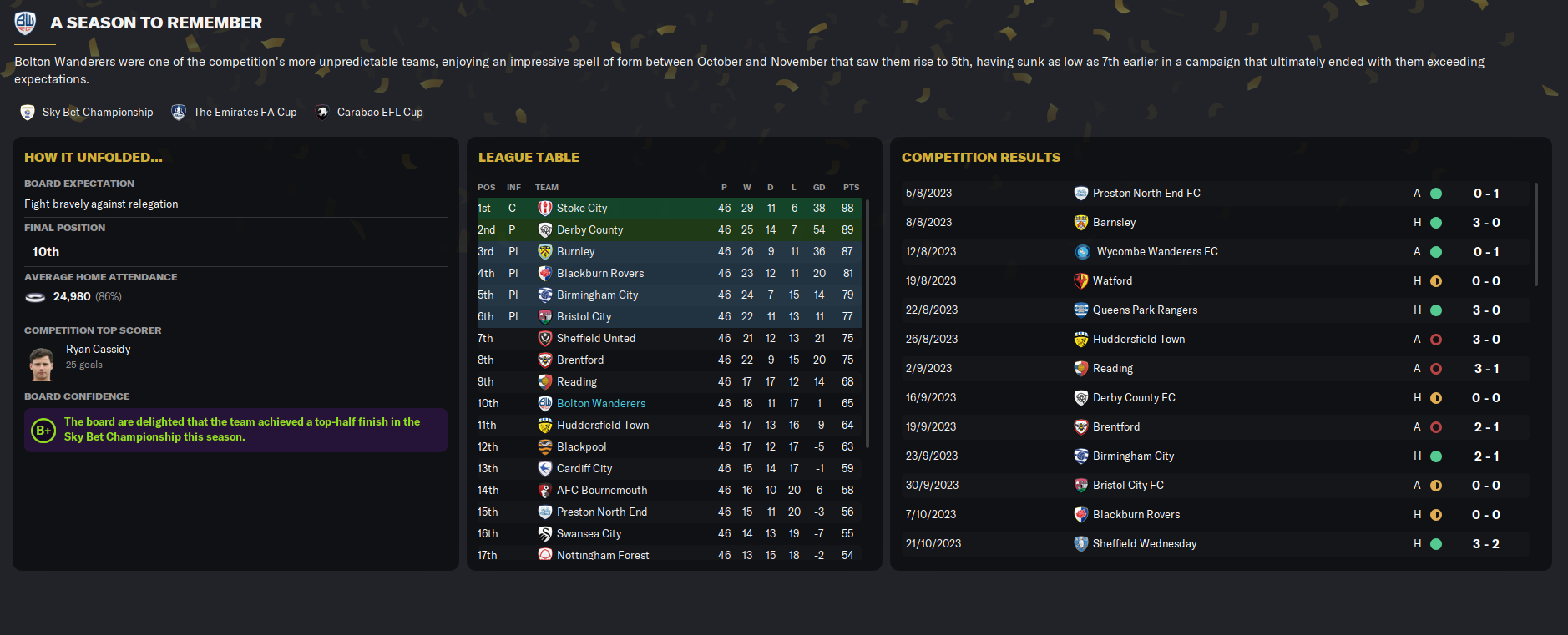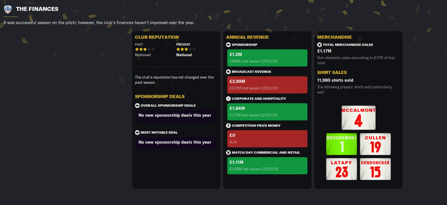 Adding to that, at the end of the season the board announced plans to build a new stadium to replace the University of Bolton Stadium, which was described as being old and having high maintenance costs. They’re currently searching for suitable sites and investors.