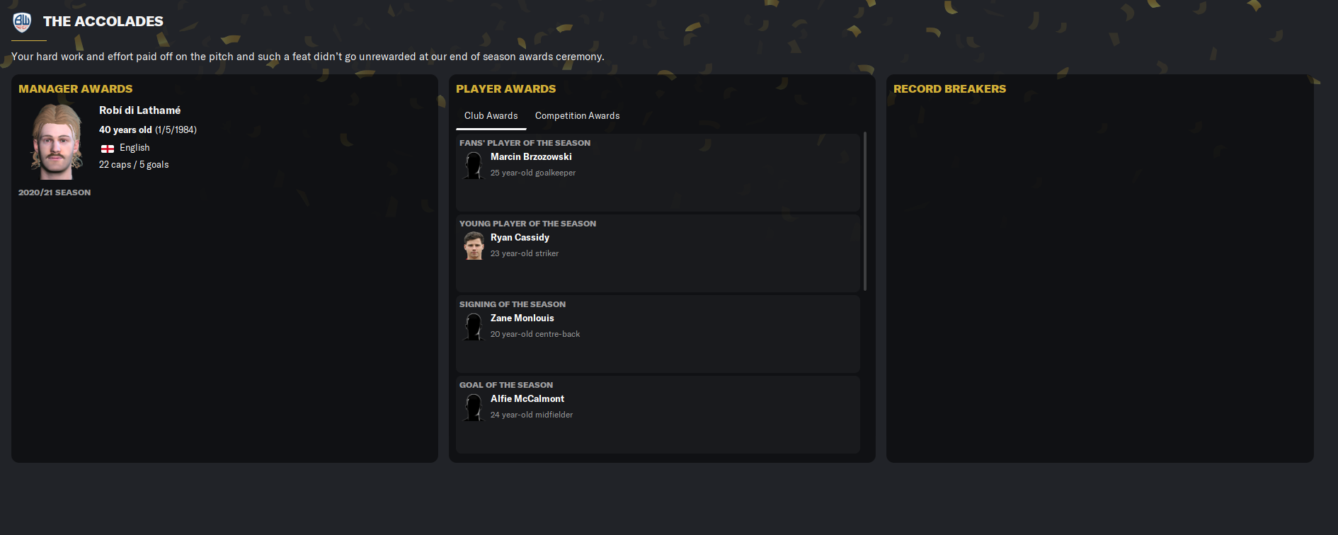 Goalkeeper Brzozowski won fans’ player of the season for the second year in a row and was named in the Championship team of the year. And he’s still only considered a League 1 keeper! Cassidy won young player, centre-back Zane Monlouis somehow won signing of the season despite having a horrible average rating and Alfie McCalmont won goal of the season.