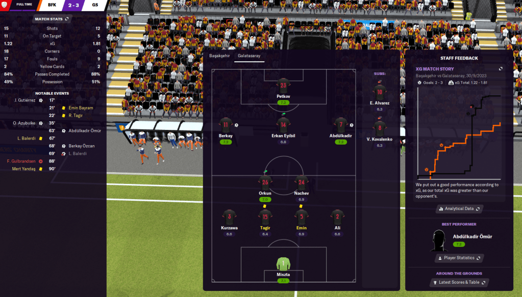 That was celebreated by putting five past Konyaspor in the first half of an away game, with Abdulkadir scoring twice… and a 5-1 win. Galatasaray signed off 2023 with Orkun scoring a screamer to open the scoring at home to Rizespor, then Erencan bagged a second half hat-trick to end the year with aplomb.