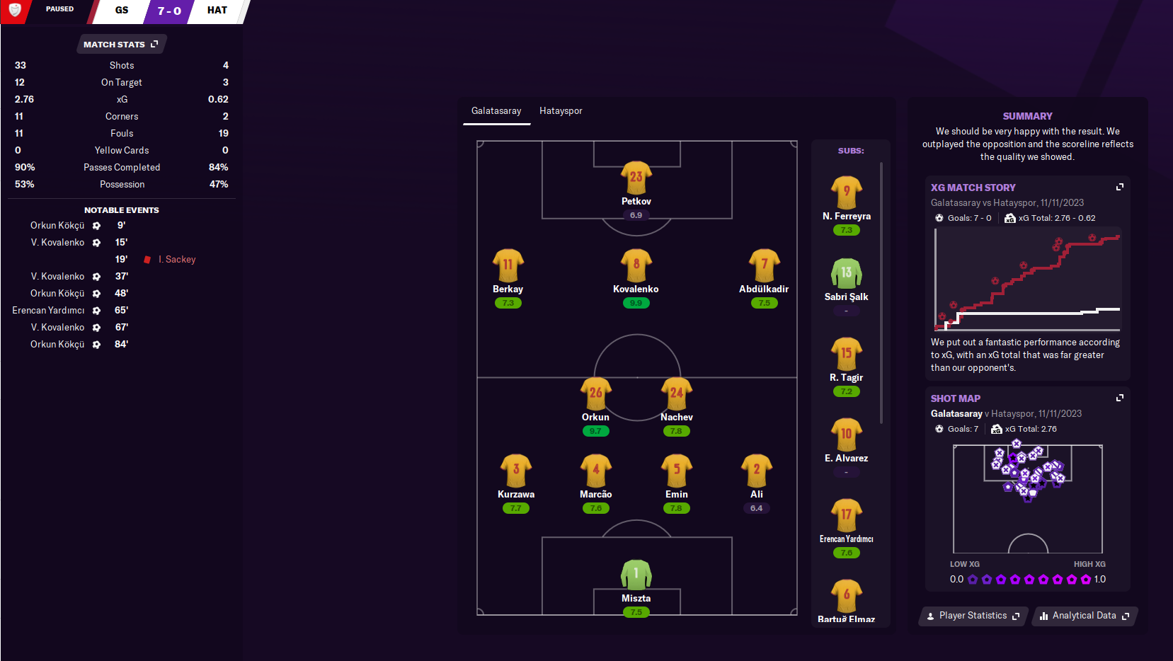 Abdulkadir was enjoying a great start to life with Galatasaray, despite the weird message below, and continued that with a brace that took him to six goals in 11 games in a 3-0 win at Gaziantep, which racked up seven consecutive league wins and nine in all competitions. That continued with Victor Kovalenko, playing in a more advanced position, and Orkun scoring sensational hat-tricks in a 7-0 win over Hatayspor.