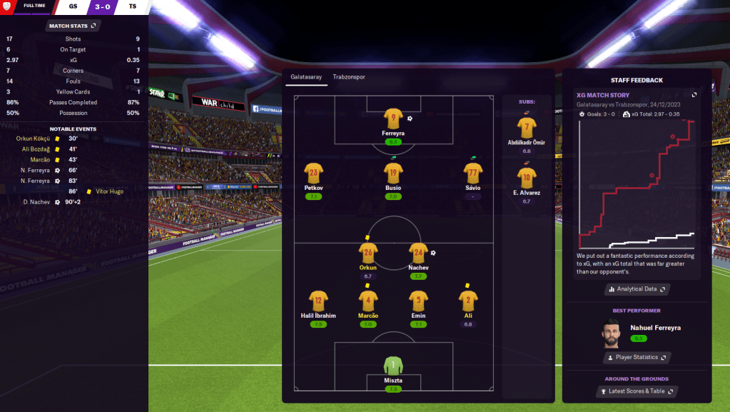 Two simple wins setup another big game at home to third-placed Trabzonspor. This time Ferreyra stepped up to open the scoring on 66 minutes then scored a sensational solo second with seven minutes remaining and Nachev wrapped up a dominant 3-0 win. That extended the unbeaten run to 17 games, the unbeaten home run to 30, and extended the lead over Besiktas to 11 points.