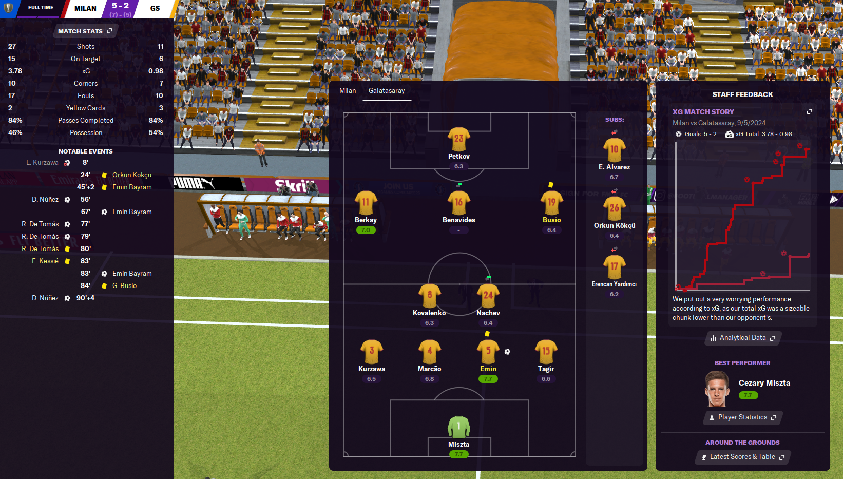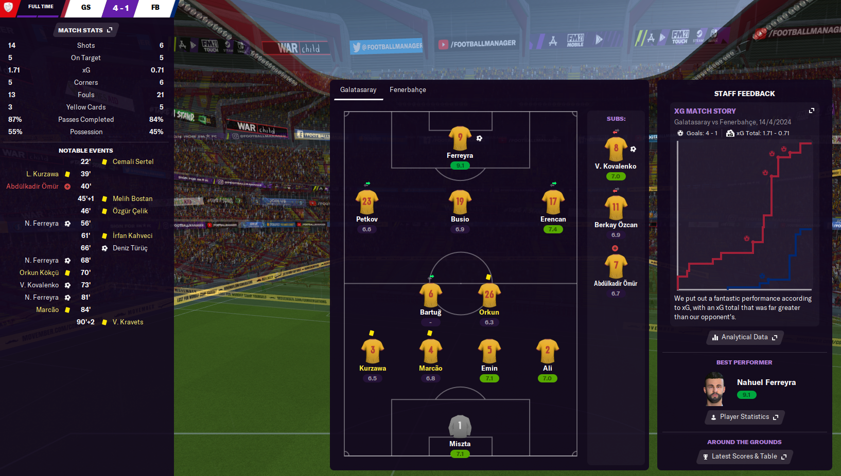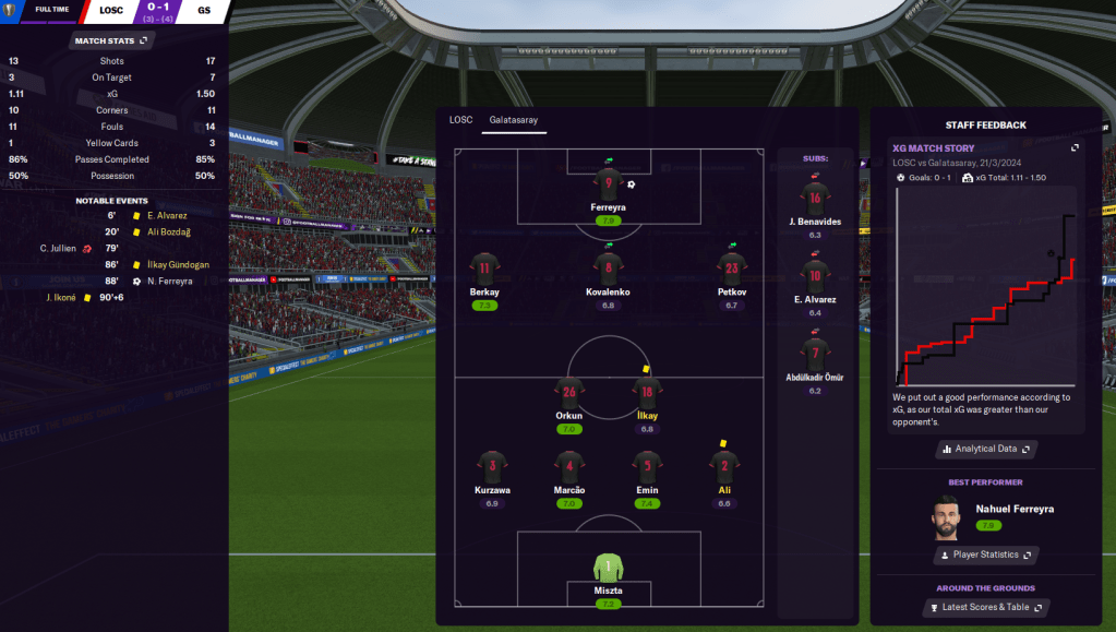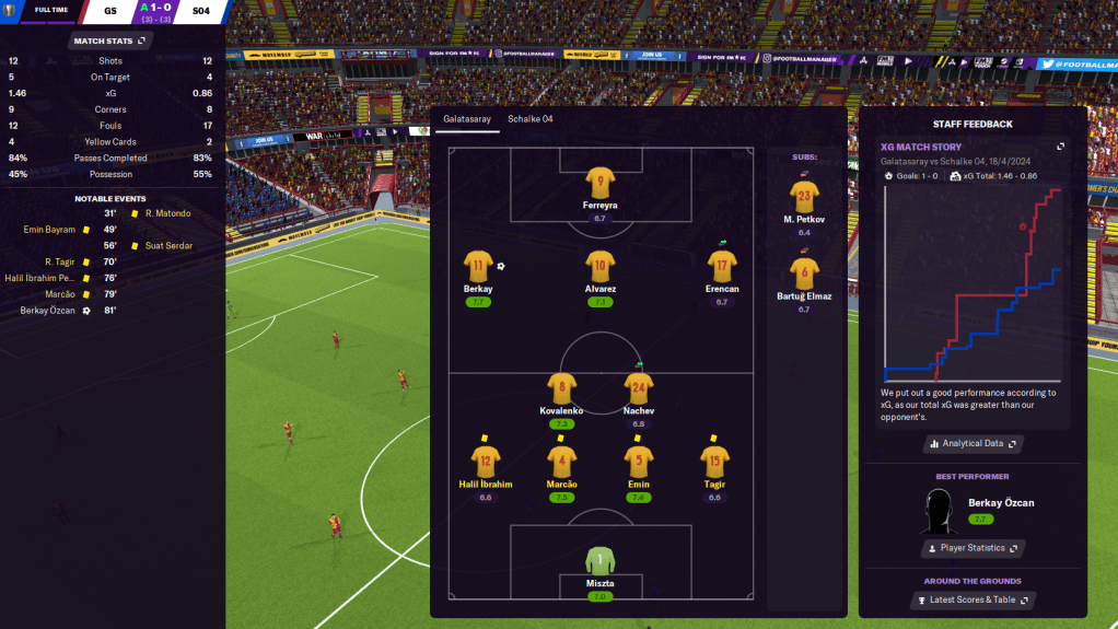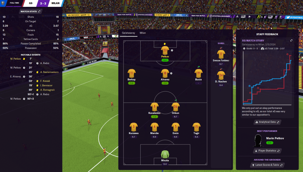 The first knockout round of the Europa League pitted Galatasaray against Sporting Lisbon – which conjures memory of his English compatriot’s FM20 Saving Sporting series. The first leg was at home and Benavides picked a good time to score his first goal for the club to give Galatasaray a 21st minute lead that Berkay doubled with a ridiculous 35-yard free-kick. Berkay doubled his tally late on to seal a surprisingly dominant 3-0 win. The return leg in Lisbon marked Latunov’s 100th game in charge of Galatasaray and Marin Petkov scored the only goal of a quiet game.