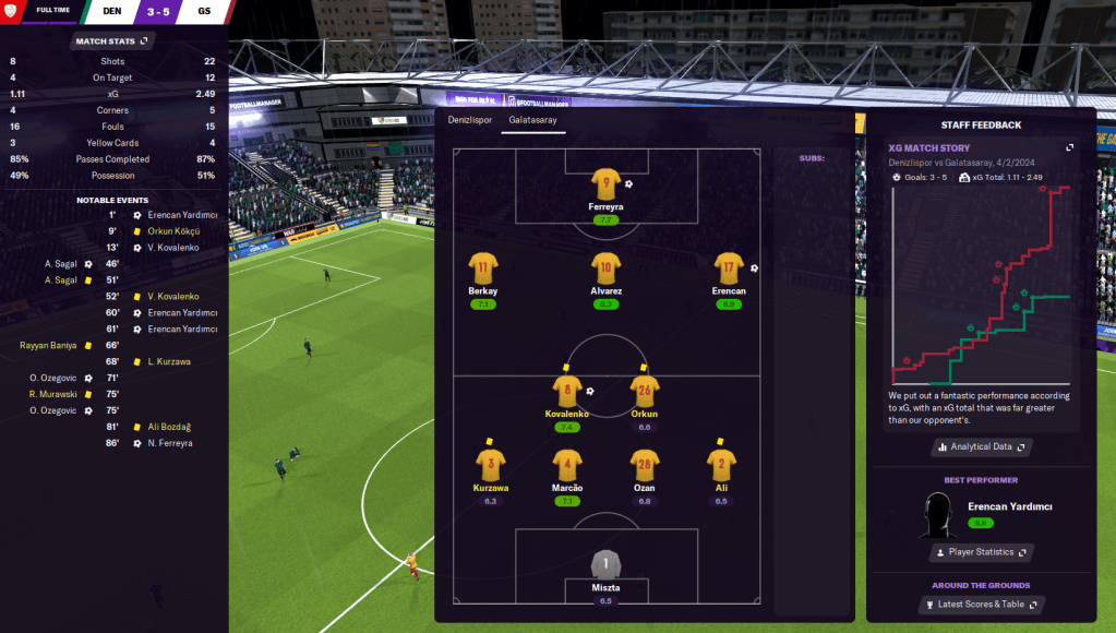 Erencan Yardimci had made a great start to 2025 and kept that going with a goal inside 23 seconds at Denizlispor, Kovalenko doubled the lead with a sublime volley on 13 minutes, before Erencan went on to wrap up a hat-trick with two goals in the first 15 minutes after the break. The increasingly dodgy defence allowed the hosts back to 4-3 but a late Nahuel Ferreyra goal sealed a 5-3 win, which set a new league record for the highest scoring game.