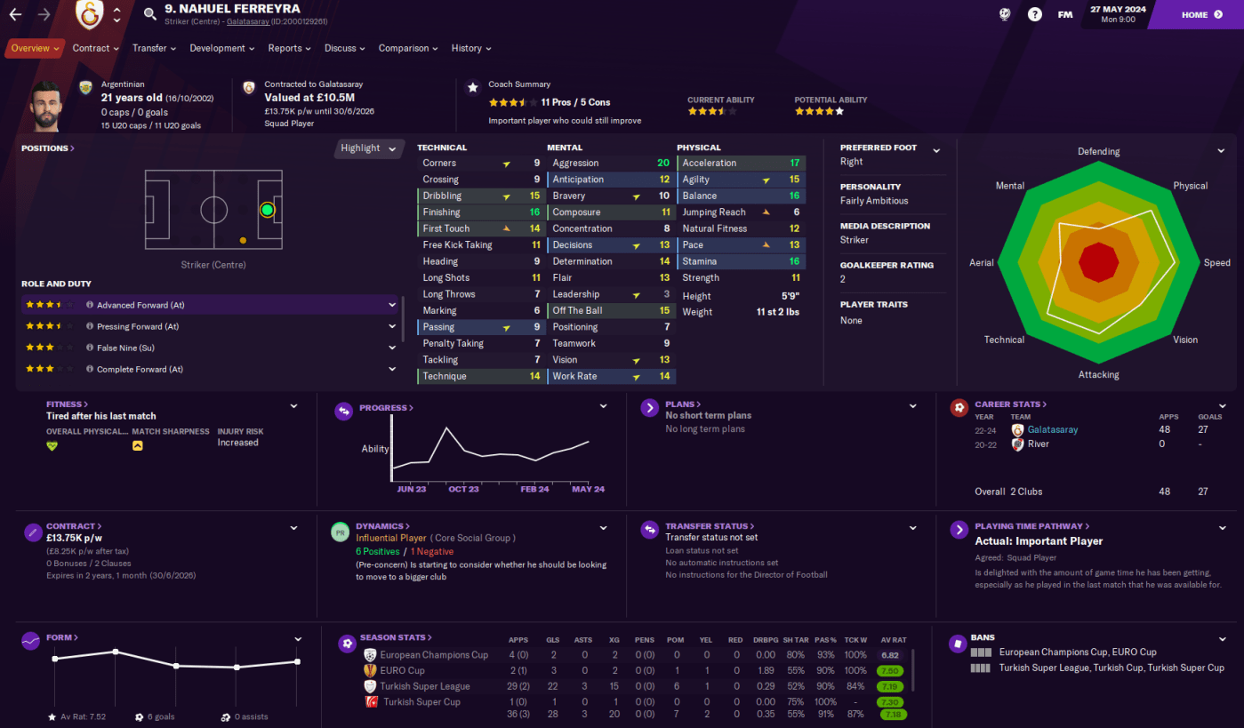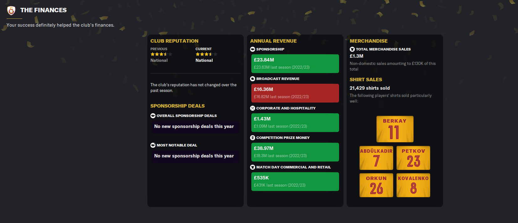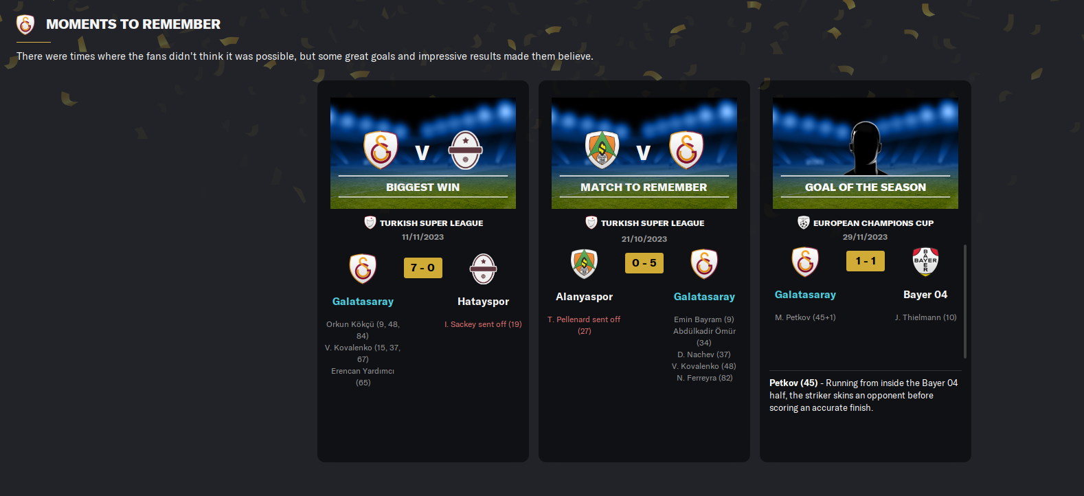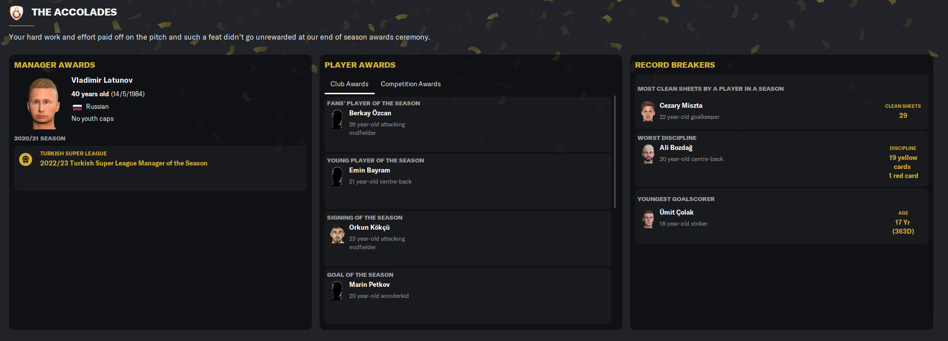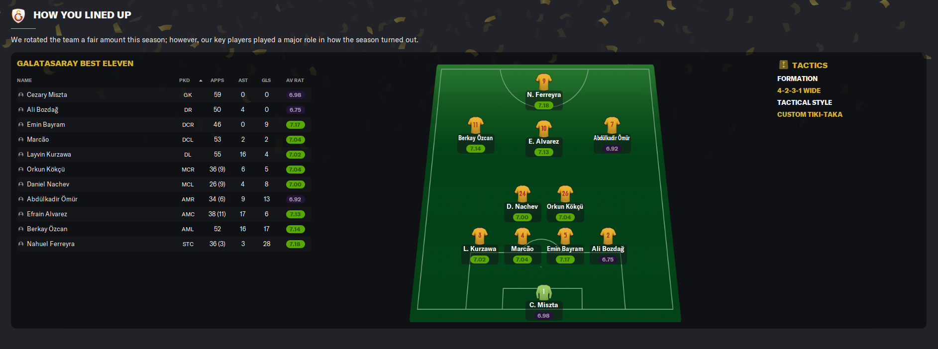 Ferreyra was the star of the season with 28 goals in 39 appearances in all competitions at a 7.52 average and won the Super League top goalscorer award with 22 in 31. Five other players made it into double figures for goals scored: Berkay (17), Erencan (15), Kovalenko (14), Abdulkadir and Petkov (both 13). Alvarez was a creative force with 17 assists followed by Berkay and left-back Layvin Kurzawa on 16, while Kovalenko got 13. Ferreyra has been amazing but how good he’ll actually be eventually will be interesting, as the Turkish league clearly isn’t the best…