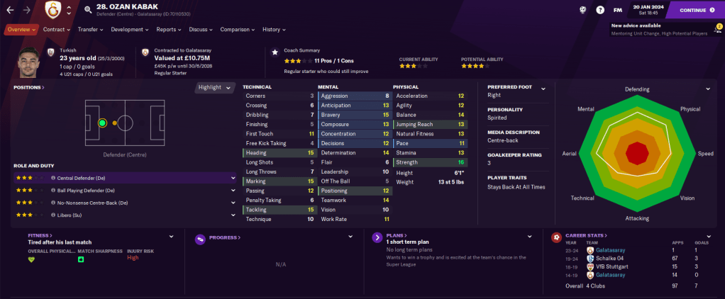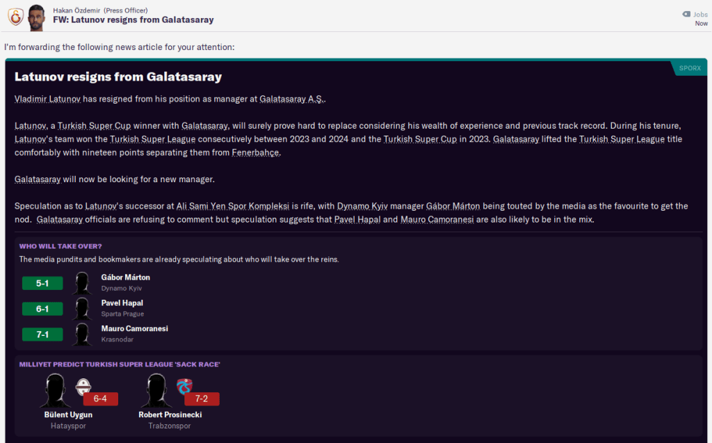 Galatasaray had been promised a “golden generation” youth intake, which turned out to be several players of 3-star potential, which cemented Latunov’s thoughts that it was time to move on to pastures new. The key aim of the save is to win every league in Eastern Europe, so there was no point hanging around Turkey and winning it at a canter for another year. However, a big stumbling block towards this was the huge compensation Galatasaray would demand of other clubs, which meant Latunov had to quit the Turkish giants and go on the job hunt.