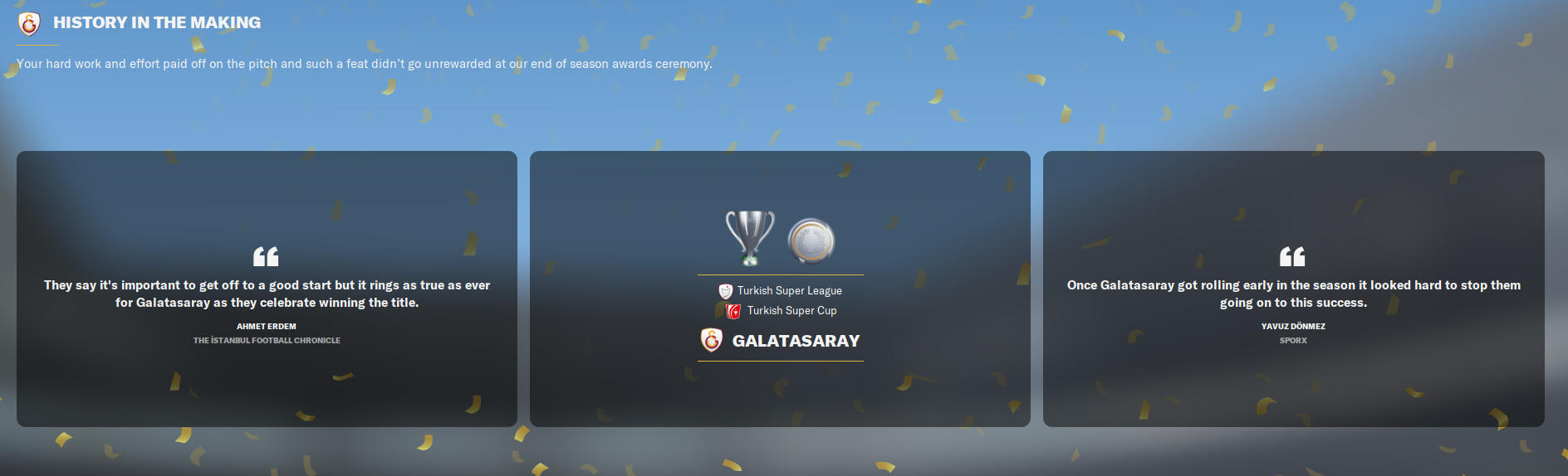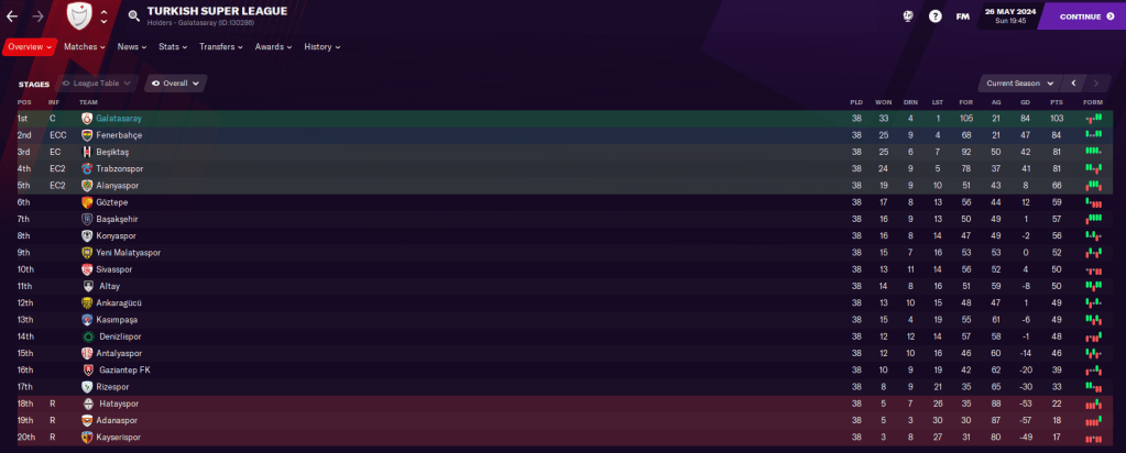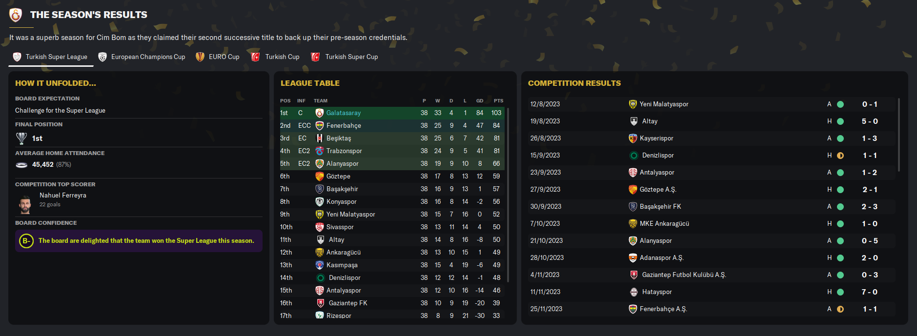 The season ended with a battering of Rizespor with 32 shots to their five but just the 3-0 win, with the pick being a brilliant finish by Ferreyra on his return from injury. However, that was enough to take Galatasaray to a new record of 105 league goals. That meant they broke the Super League record for most wins (33), goals scored (105) and most points (103), as well as the longest-ever winning streak of 20 games.