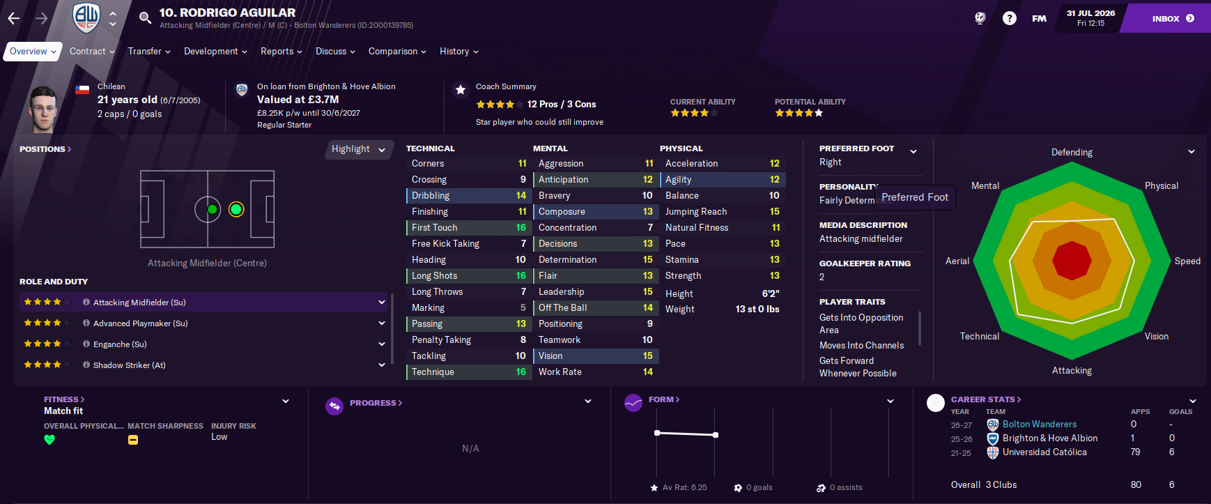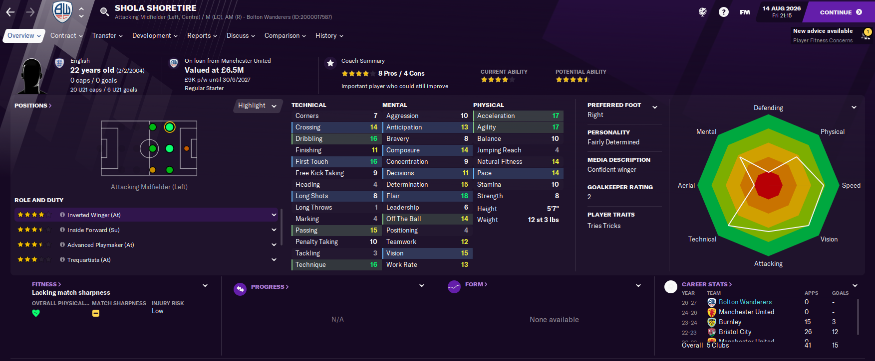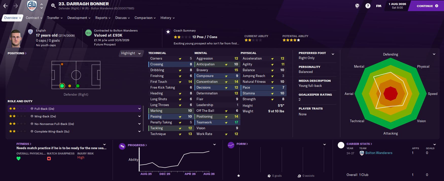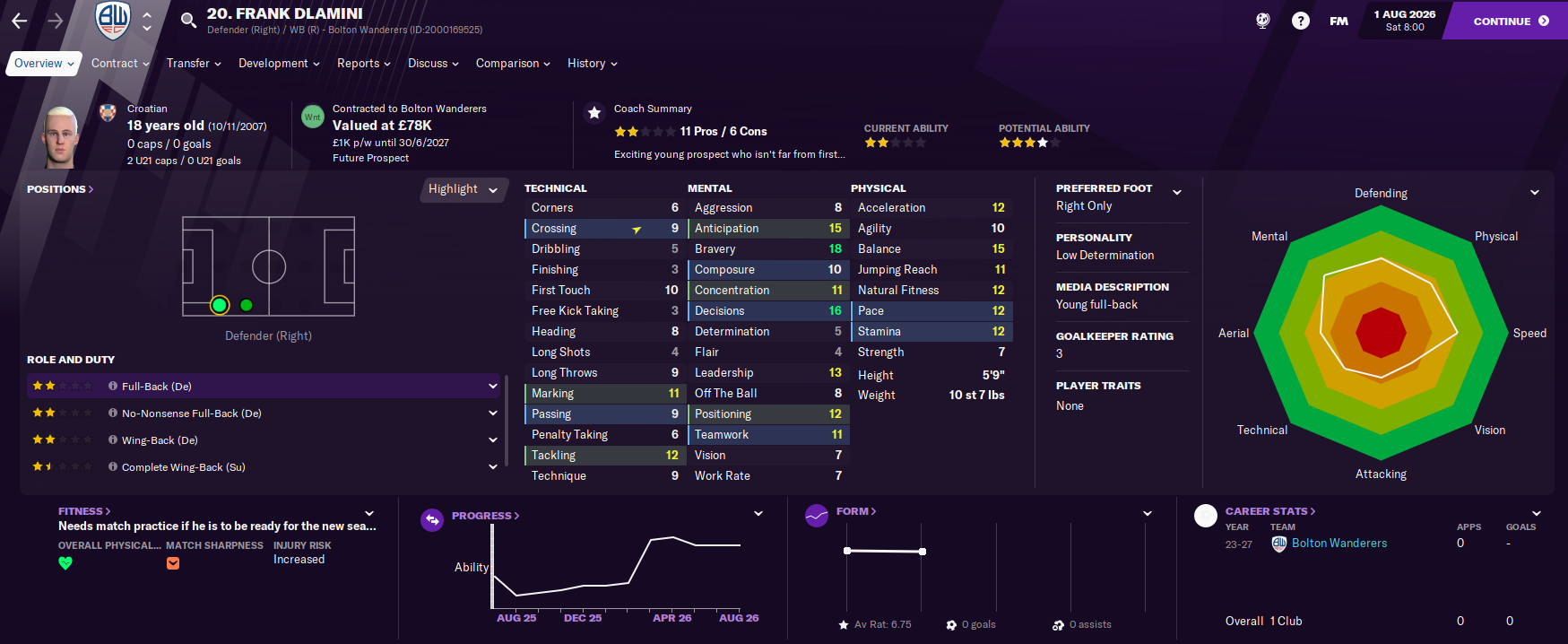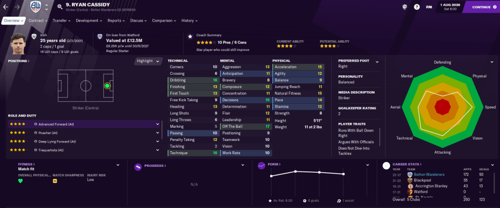 The key piece of transfer news was a fifth loan spell at University of Bolton Stadium for Watford loanee Ryan Cassidy, who Watford are still happy for us to have and only 20% of his wages despite him being better than all their strikers! Joining him on loan was Chilean midfield starlet Rodrigo Aguilar, who comes in for the season from Brighton. We again spent zero money, instead relying on free transfers to bring in former Chelsea man Alfie Gilchrist, who’ll largely play at right-back, and former Liverpool midfielder and defender Doug Carratt. We later added more quality on loan in Chelsea striker Nathan Higgins and Man United winger Shola Shoretire, who I’d been eyeing up for a few seasons.