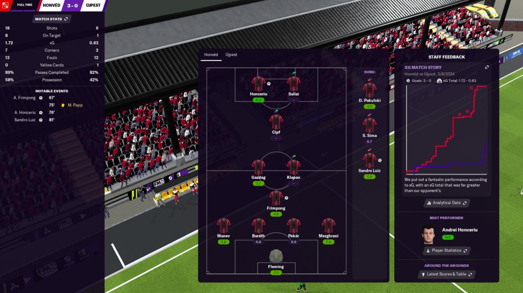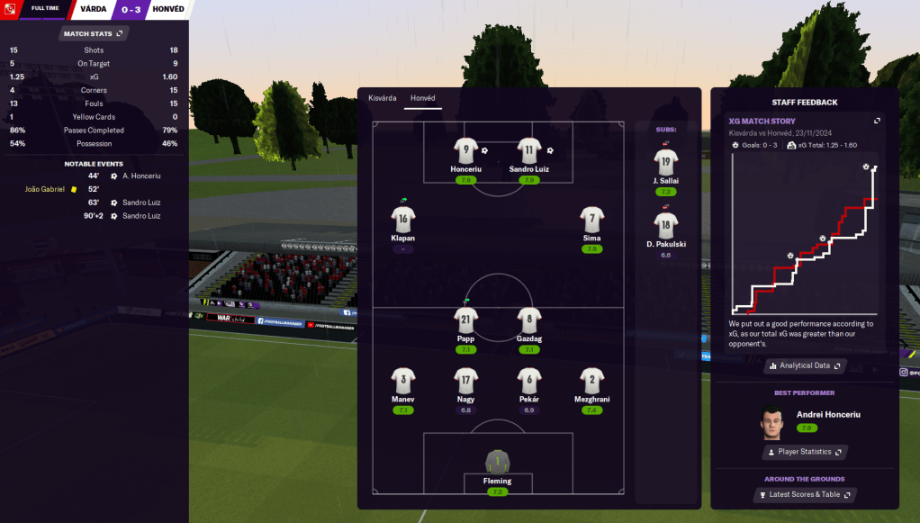 Given the lack of goals, Latunov ripped up his narrow tactic and switched to an attacking 4-4-2, which also allowed him to draft 17-year-old Sallai, who’d been developing nicely in training, into the team. And the new formation had exactly the desired effect as the two strikers Honceriu and Sandro Luiz scored from crosses by the two wingers Sima and Sallai, before Sandro Luiz doubled his tally with a lovely pass from another exciting 17-year-old, midfielder Károly Papp. And the media claimed “Latunov’s tactical gamble paid off.”