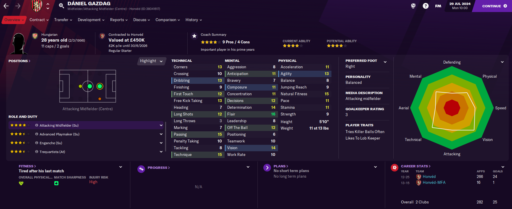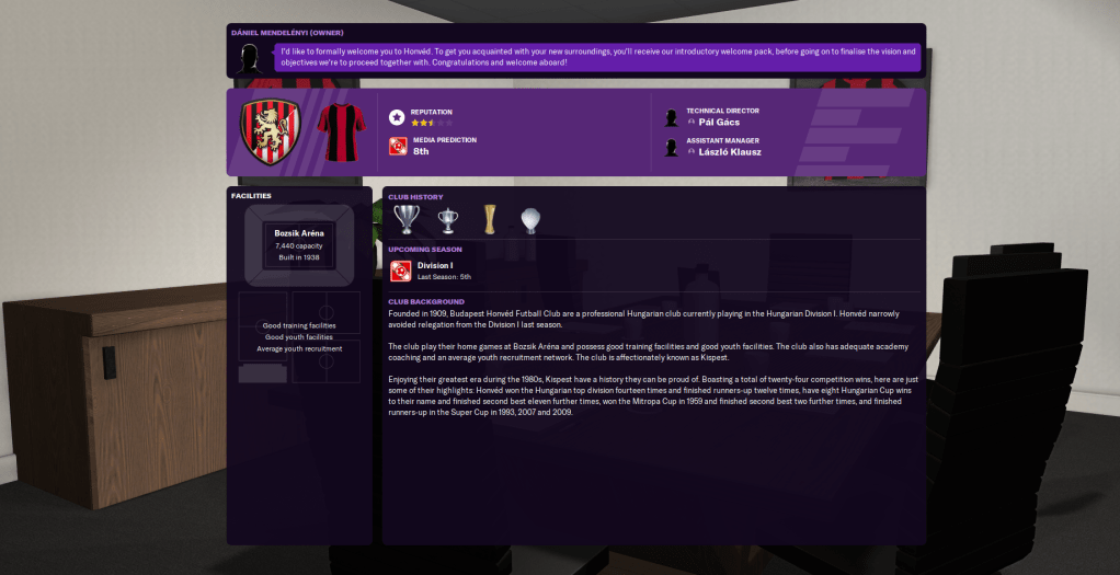 The club plays at the 7,440 capacity Bozsik Arena, which was built way back in 1938. It won its most recent and 14th Hungarian title in 2017, but only narrowly avoided relegation from the top tier last season. It has good facilities and average youth recruitment, which is a decent start, and the board expect the manager to develop young players, play entertaining football, and finish in mid-table. So this represents a whole new challenge after three years of walking to league titles.
