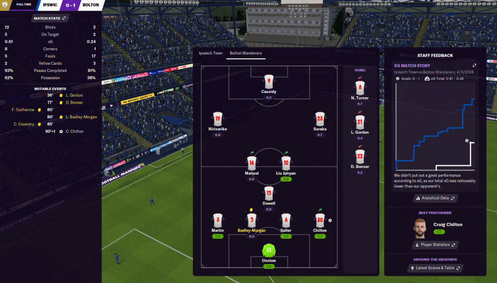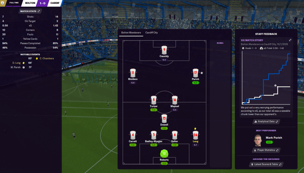 2028 began with an FA Cup Third Round match on New Year’s Day. We were away to Colchester United and played terribly to draw 1-1. However, the return leg at Bolton was a proud day as academy product winger Solomon Suraka came off the bench to score on his debut and seal a 2-0 win. At the age of just 16 years and 162 days that made him the youngest goalscorer in Bolton history.