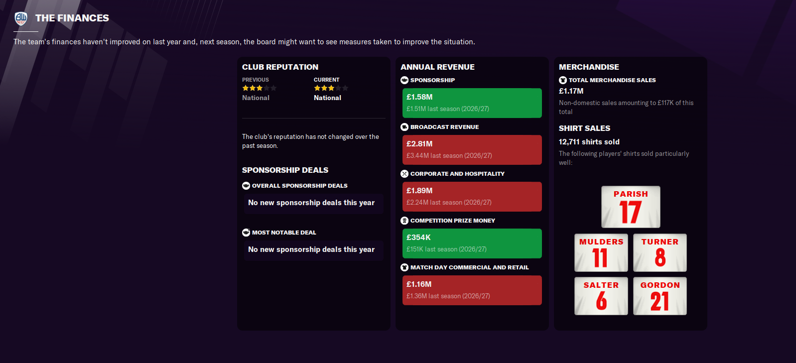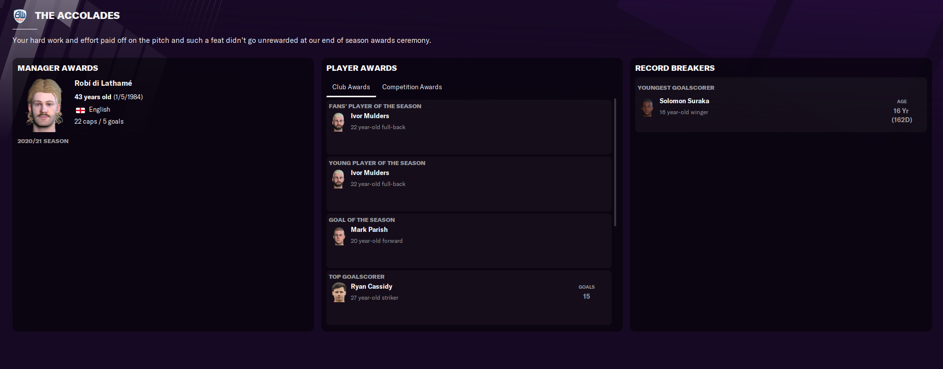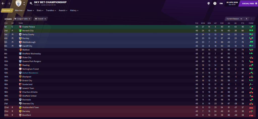 But we did manage to pick up a 3-0 win over Huddersfield, in which Salter scored and Martin and Chilton both got assists. And defeated playoff-chasing QPR 1-0 in our final home game, with Roberts winning player of the match with nine saves. We finished the season by “facing the impossible” at champions Crystal Palace, which we’d probably lose anyway so I threw loads of youngsters in. Four kids made their debuts and we unsurprisingly lost 3-0.