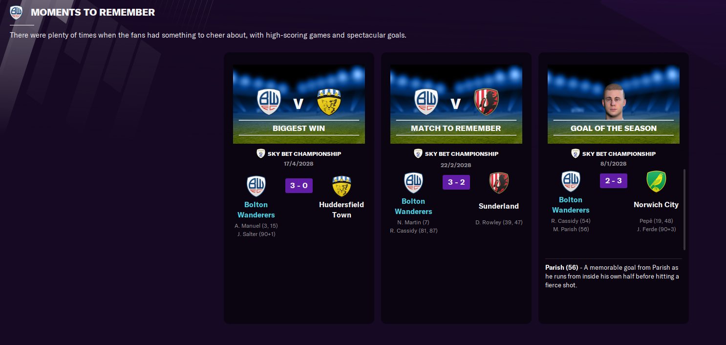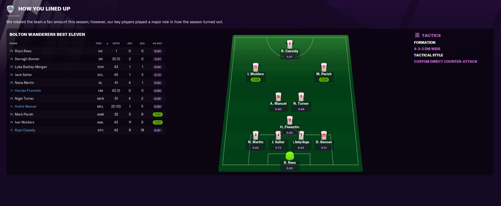 For a change, Cassidy wasn’t our star player, in fact he had his worst Bolton season despite still being our top scorer with 16 goals in 42 appearances. Instead, the main man was left-winger Mulders, who scored nine and led the assists chart with 11. Another star man was right-winger Parish, who scored nine and created five goals from 32 appearances, due to several injuries. Roberts also impressed with a 7.03 average rating.