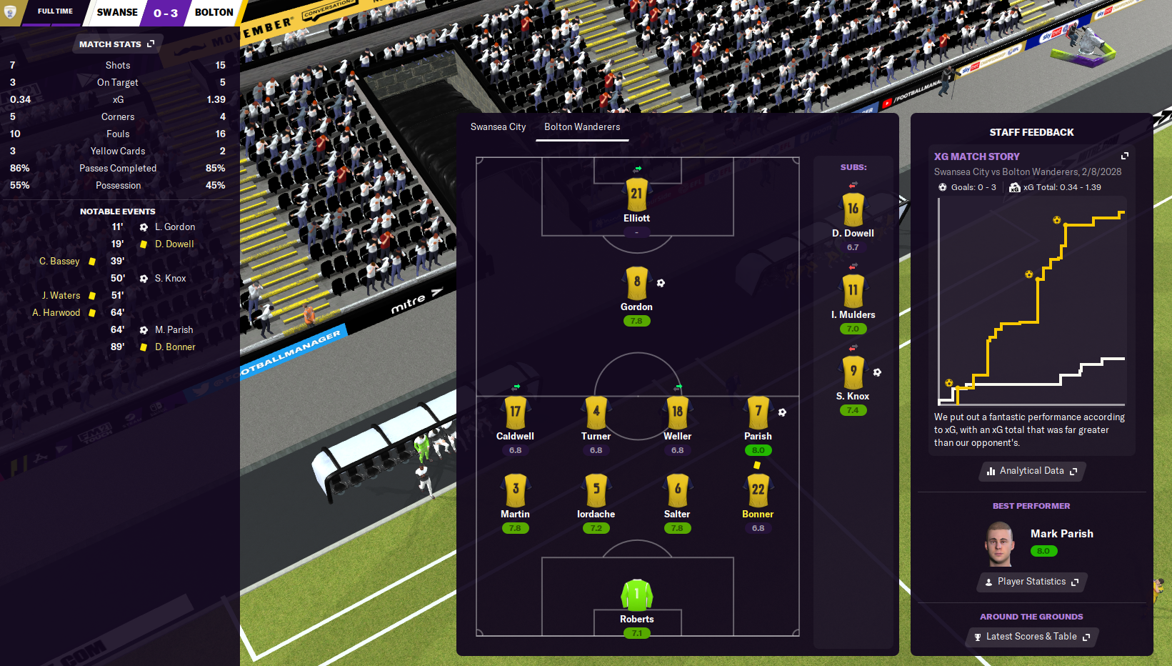 That was followed by an even better performance to win 3-0 at Swansea. We started excellently as young midfielder Lewis Gordon scored after 11 minutes, then Knox doubled his club tally by nodding home a superb Nana Martin cross. And Parish wrapped up the win with a delicious free-kick just after the hour.