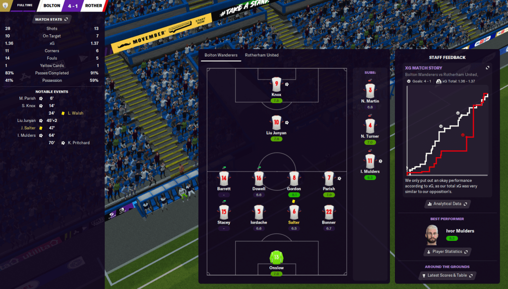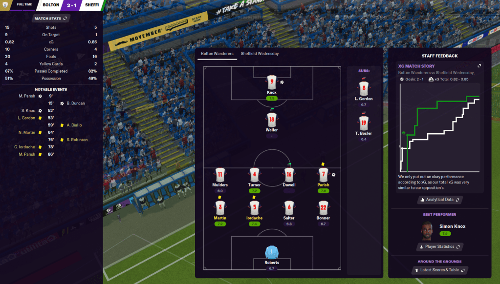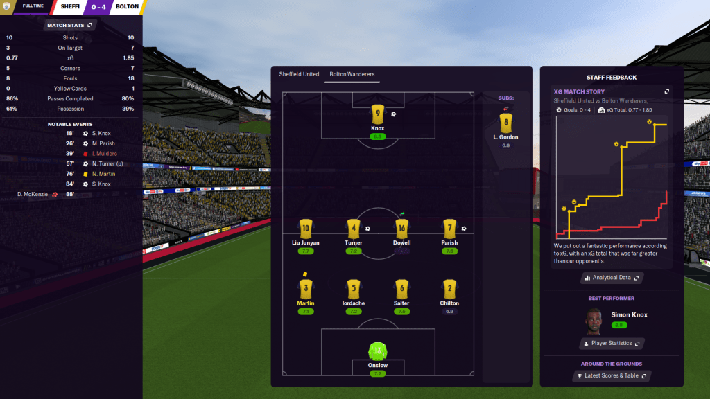 Another clean sheet saw us beat QPR 2-0 with a Mulders brace on his return from injury and that shot us up to fourth in the league! We then took the lead at Sheffield United with an excellent move between Gordon and Junyan teeing up Knox, before Parish doubled it with a wonderstrike eight minutes later. However, Mulders got sent off for a shocking tackle just before the break and I expected a backlash. But our counter-attacking style worked nicely as Knox got sent free to win a penalty that Turner tucked home, then Junyan and Knox went clean through on goal and combined for Knox’s second. An amazing 4-0 win with ten men – what a performance!