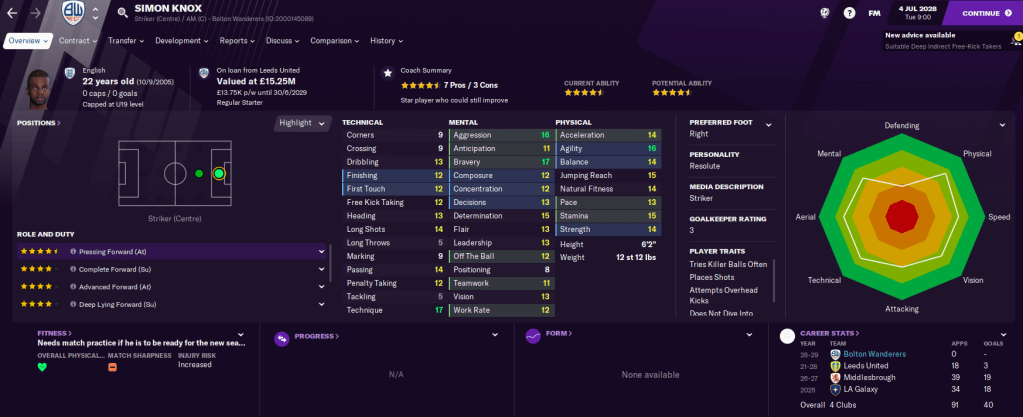 The striker option was difficult to fill as Watford finally refused to let us have Ryan Cassidy, who scored 127 gaols in 246 league games for us, back on loan. In his place, we loaned a very exciting player in 22-year-old Leeds man Simon Knox, who’s been dubbed “the new Alan Shearer” and scored 19 in 39 on loan at Middlesbrough in the Championship two seasons ago. We also brought in 18-year-old Red Bull Salzburg striker Tom Bosler to support him.