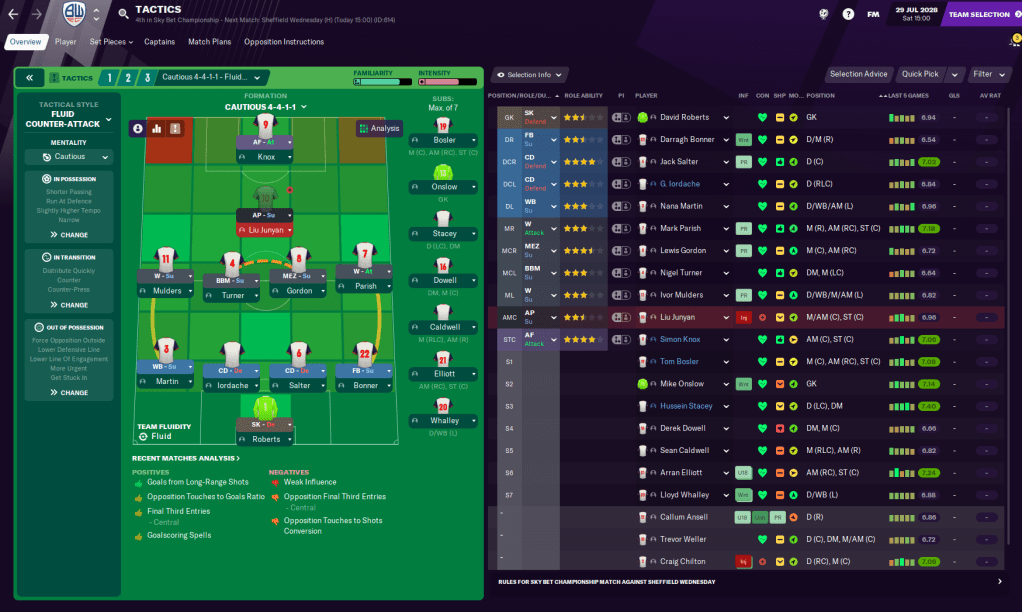 I’m also considering a slightly different tactic to try and shoehorn youngster Liu Junyan, who’s shown great development over the summer, into the team. The new tactic is a 4-4-1-1 with Liu in the hole behind Knox. Here’s what we’re working with to start the season: