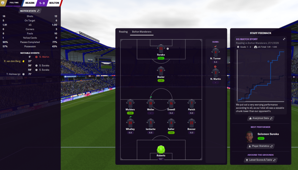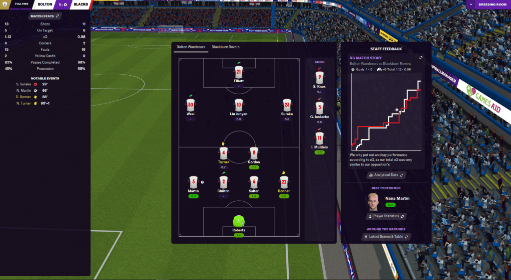 Another poor first half followed, in which the only highlight was a Suraka disallowed goal. But we were easily the better team and went ahead through Nana Martin’s long-range strike. I made three late subs to ensure we had 11 Bolton academy players on the pitch for the first time to finish the campaign. And Martin’s strike was enough to send this great stadium off with a win.