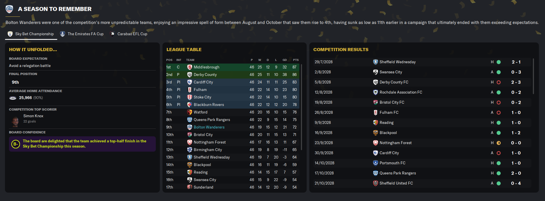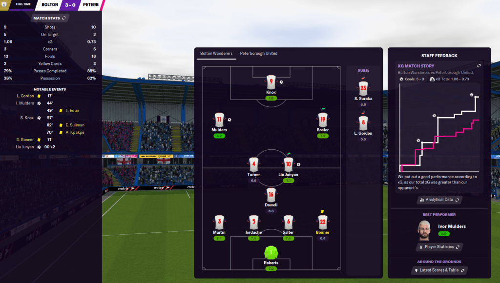 The season concluded with two home games, which would sign off Bolton Wanderers’ 32-year stay at the University of Bolton Stadium aka Macron Stadium aka Reebok Stadium. The penultimate game was a shocking 0-0 against Sunderland, in which both teams had four shots and one on target each.