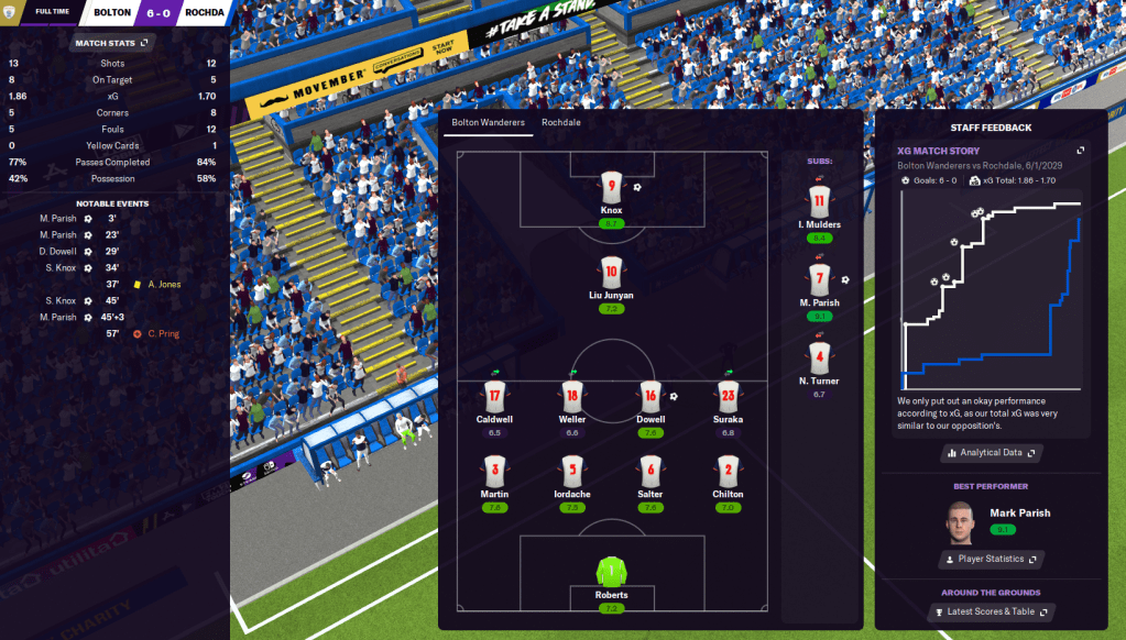 Next up was a Lancashire derby at home to Rochdale, which for some reason was on TV. And we put on an exciting, very misleading show for anyone who tuned in. Right-winger Mark Parish – who my assistant Freddie Ljungberg this we should drop – bagged a brace inside 23 minutes, before academy product midfielder Derek Dowell scored his first for the club with a screamer. “The new Alan Shearer” Simon Knox also bagged a brace before Parish completed his hat-trick in first-half injury-time. SIX-NIL up at half-time! Nothing happened after the break and we won 6-0. Classic FM. But that’s the biggest win of the save so far.