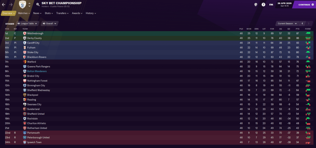 Man City ended United’s streak of three titles in a row, with United in second, Chelsea third, Spurs fourth and Liverpool fifth. Shocker. Palace, Villa and Burnley were relegated. Middlesbrough won the Championship, Derby got promoted and Fulham won the playoffs. Portsmouth, Peterborough and Ipswich went down.