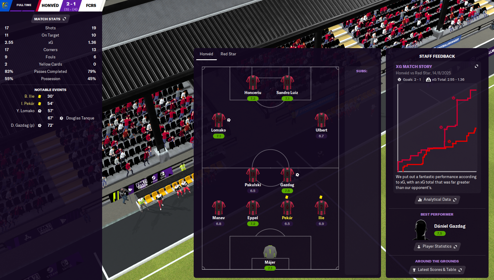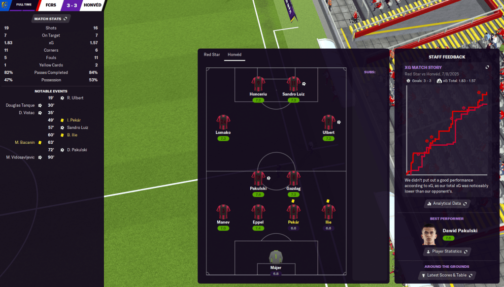 A much tougher test followed against former European champions Red Star Belgrade. The away leg was first this time and Honvéd started well with Lomako crossing for opposite winger Renátó Ulbert to open the scoring. Red Star came flying back to lead 2-1 at the break but Honvéd didn’t wilt and Sandro Luiz’s first of the season then a Dawid Pakulski screamer restored their lead. The Serbian side nicked a late equaliser to make it 3-3, but what a game and a solid result. The return leg started slowly but Lomako opened the scoring just before the hour mark, Red Star equalised, then Sandro Luiz won a penalty that Daniel Gazdag tucked away to seal a 2-1 win and cause a major upset.