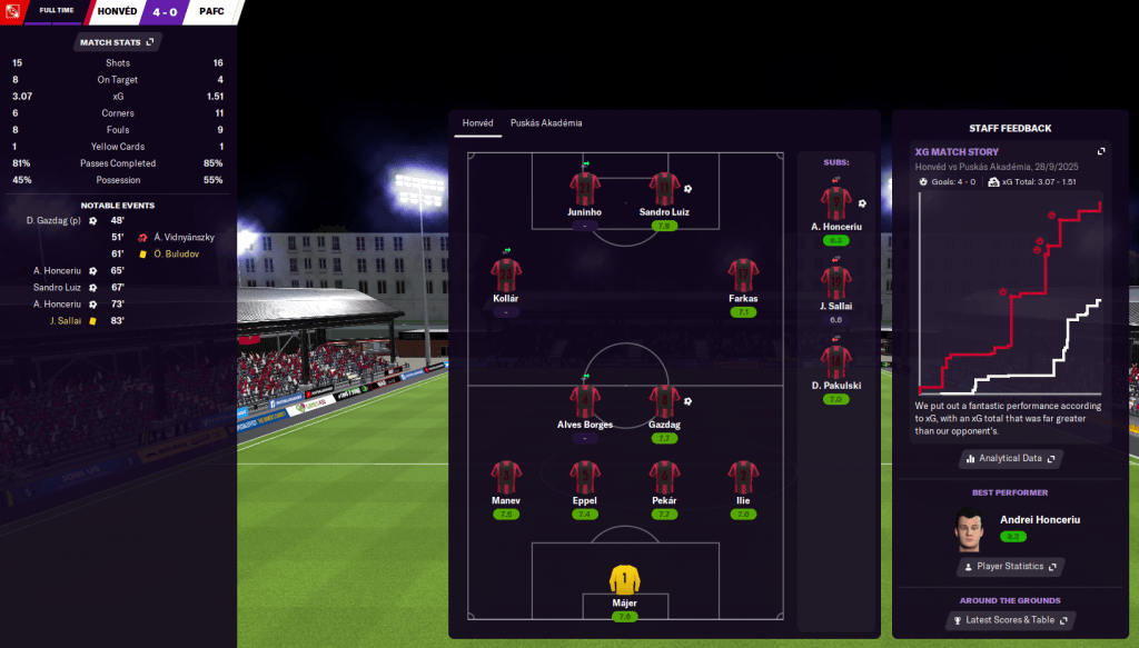 Next up was a home game against newly promoted Dorog, who had a player sent off after five minutes and the floodgates opened. Sandro Luiz got things going, Kollár scored his first senior goal, and Honceriu made it 3-0 by half-time. They scored a fluke cross goal and Eppel got his first goal for the club in a quiet second half for a 4-1 win that sent Honvéd top. The good form continued at home to MTK, in which Honvéd again led 3-0 at half-time and Sandro Luiz stole the show with a brace in a 4-0 win, then 3-1 at Mezokovesd.