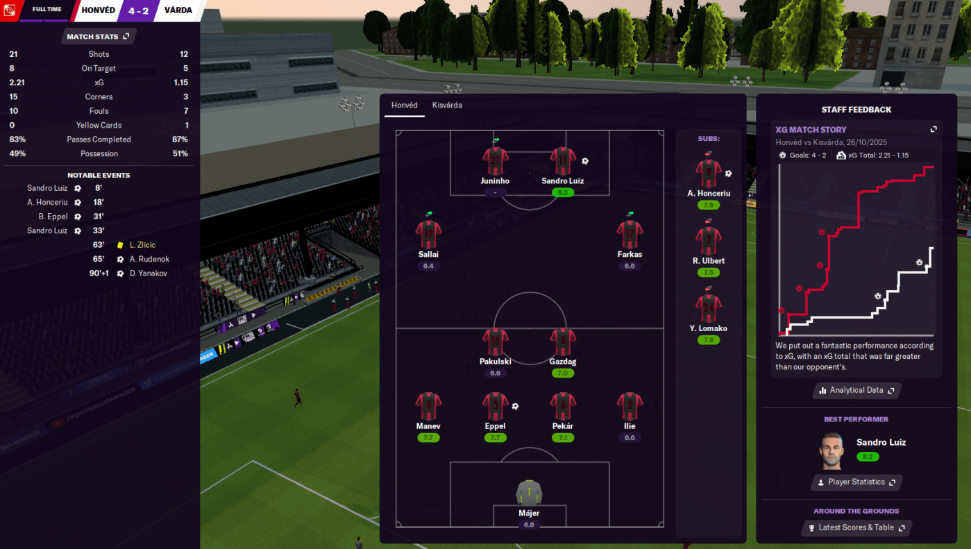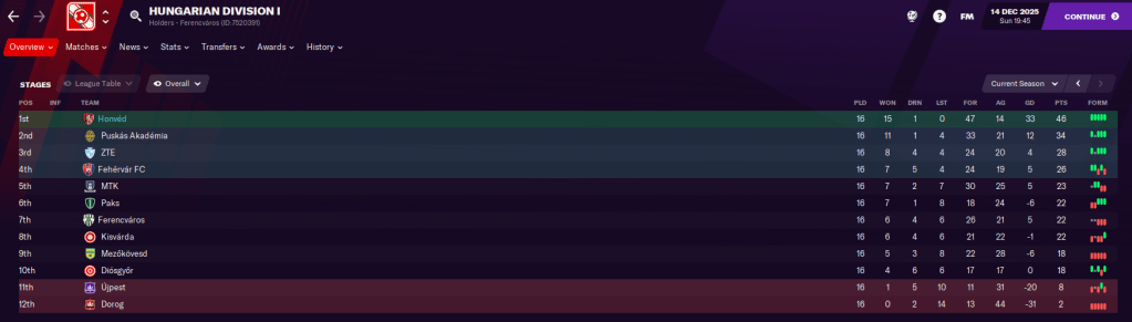 Honvéd headed into a month-long winter break with a trip to Fehérvár. They again racked up huge amounts of shots (28) but nicked it through a 55th-minute penalty by Gazdag. That took Honvéd to an outrageous 10 straight league wins and 15 wins from 16 played, which ensured a 12-point lead heading into 2026.