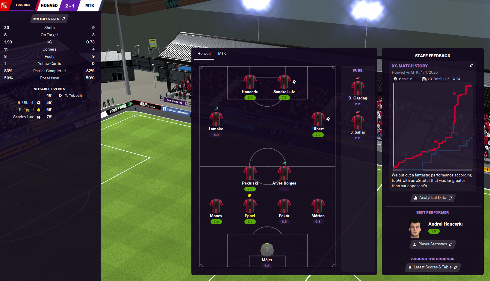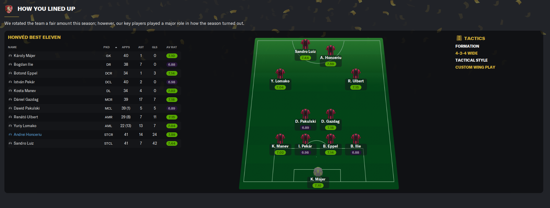 His strike partner Honceriu also impressed, with 24 goals and 14 assists. While Ulbert scored 11, Kollár got 10, Juninho got nine and Lomako and Gazdag scored seven. Gazdag also racked up 17 assists, Lomako got 13, Farkas got 10 and right-back Bogdan Ilie and Ulbert got seven. Honceriu had the best average rating of 7.59, followed by Sandro Luiz on 7.44, Gazdag on 7.18 and Ulbert on 7.15.