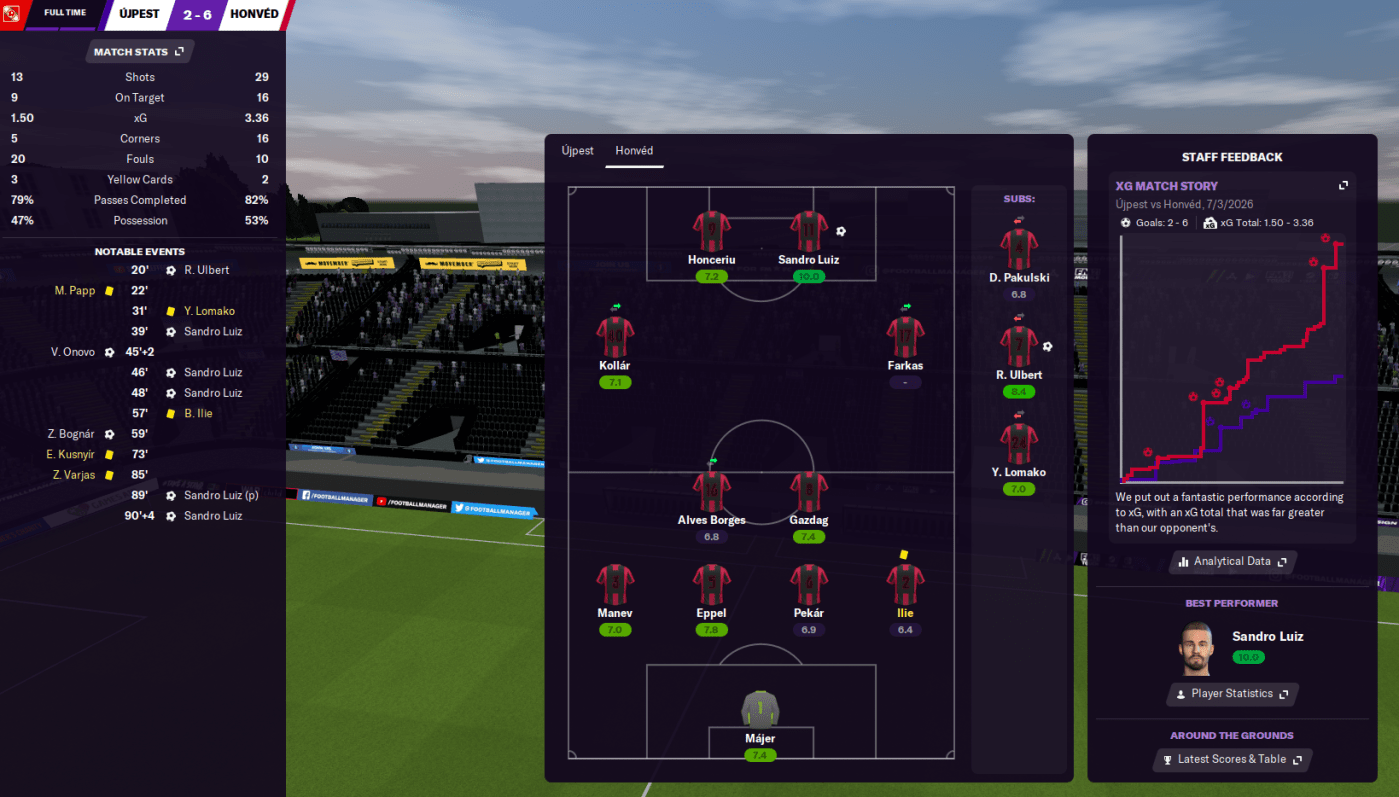 Another tough game followed with Honvéd’s first home game of 2026 (in mid-February). They were taking on third-place ZTE, who got promoted last season but are performing superbly to sit in third place. But another strong start saw Sandro Luiz score in the first 21st and 22nd minute before wrapping up his hat-trick in the 59th minute to seal a 3-0 win. That takes him to 23 goals in 21 league games – this guy is ridiculous! And his great form attracted a £3 million bid from Krasnodar, for a guy who came on a free transfer 18 months ago.