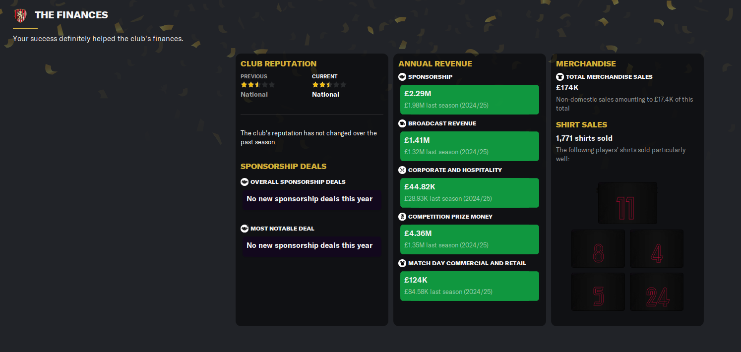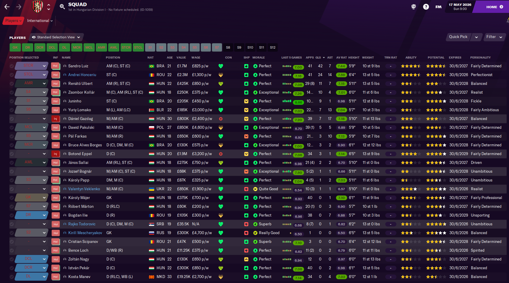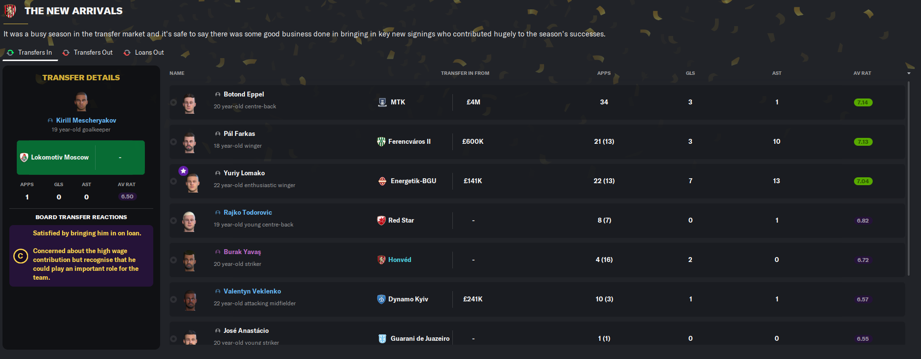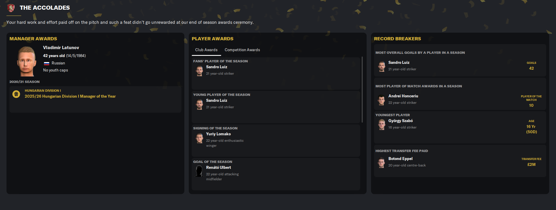 Sandro Luiz unsurprisingly won fans’ player of the season and young player of the season, Lomako won signings of the season, and Ulbert got goal of the season. However, Honceriu won the league’s Player of the Year award and Májer, who just turned 18, won Goalkeeper of the Year. And Latunov won Manager of the Year. As a result, Sandro Luiz, Honceriu and Latunov were all added to the club’s favoured personnel list.