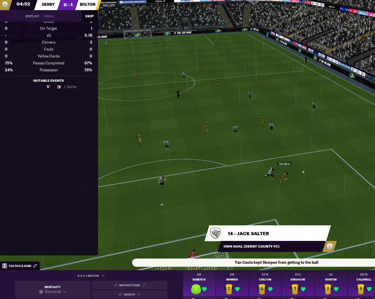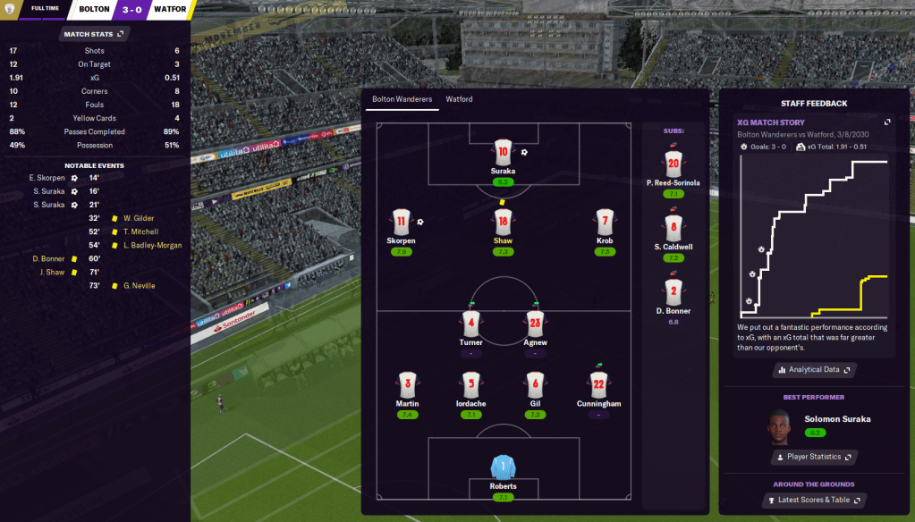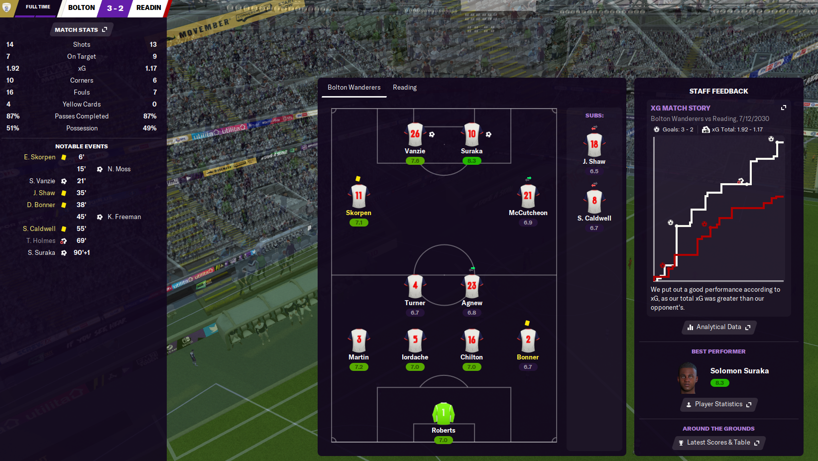 After four defeats in five, we’d suddenly gone seven unbeaten, which lifted us to fourth in the table! One of the main reasons behind this turnaround was midfielder Caldwell, who’s now wanted by PSG and several mid-table Premier League sides! And he showed why with the opener against Portsmouth, before Vanzie and Shaw both scored their first Bolton goals late on to seal a 3-0 win. We kept the good times going with a solid 1-0 win over Swansea thanks to another Suraka goal. And that took us second in the league!