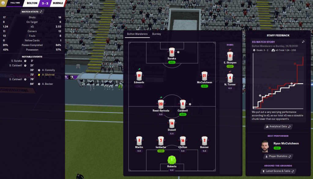 I can’t deny that I panicked – despite Norwich and West Ham being way too good for this level – and returned to our tried and trusted formation, and it worked. An exciting moment for the club saw academy product winger Ryan McCutcheon come in for his first start and immediately create a goal for fellow Trotter talent Suraka, who’s now become a wonderkid, then another for Caldwell. Burnley came back into it but McCutcheon played in Skorpen to setup Caldwell for a vital third.