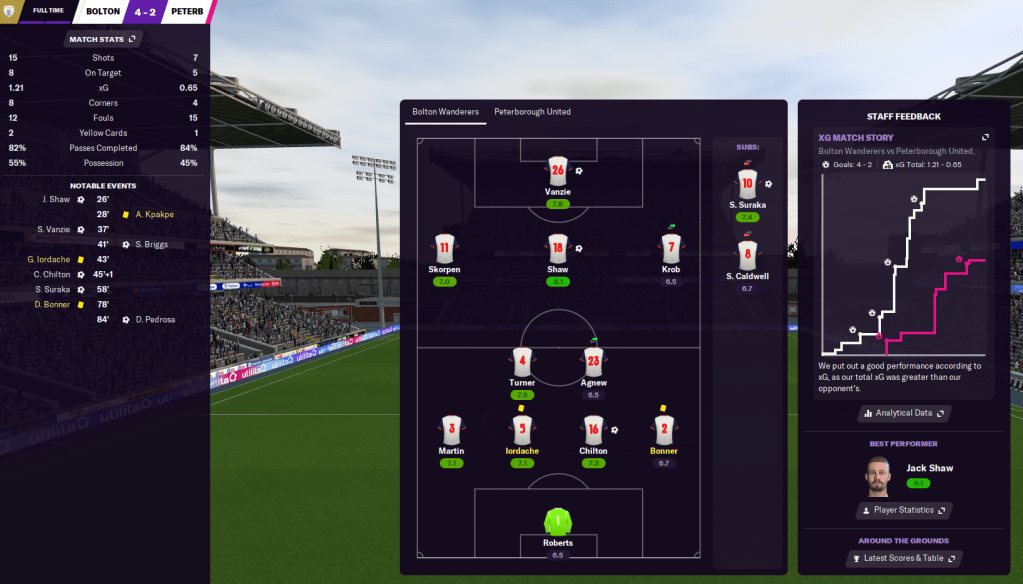 Shaw had his best game yet as he scored a stunner then created the second for Vanzie, on his first league start, at home to Peterborough. The visitors scored with their first shot – because why wouldn’t they? – but Craig Chilton, getting a run of starts at centre-back, scored his first Bolton goal and Suraka made it comfortable before a late consolation.