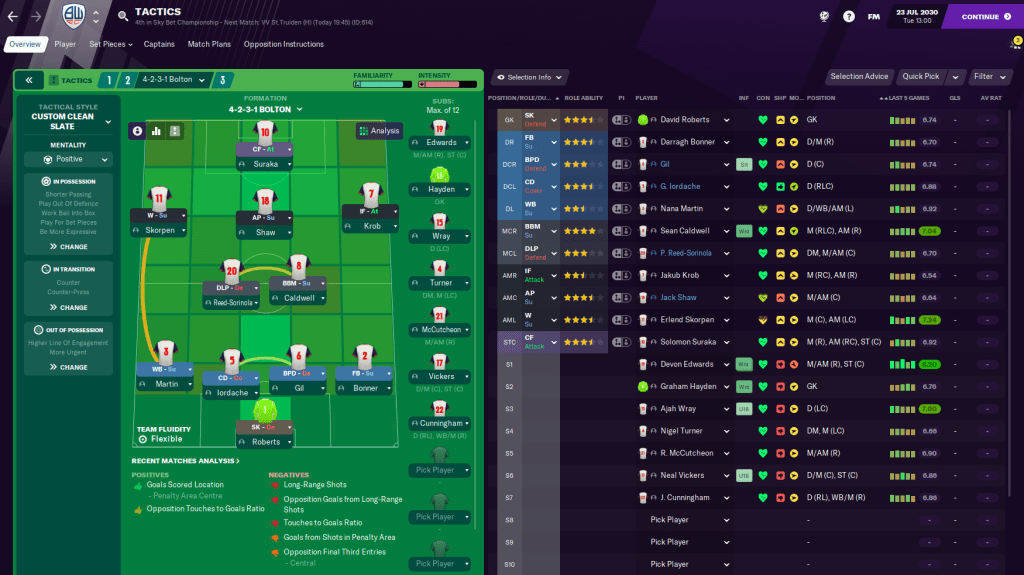 With the new signings and players available to us, I decided to totally switch up our formation and tactical approach for the new season. I’m now looking to use a 4-2-3-1 formation with hot prospect Solomon Suraka up front and Shaw in the hole behind him. I’m also moving away from the direct passing approach, with more of a focus on nicer football. I felt like playing the holding midfielder was a waste of time last season and I want us to be a bit more expansive as we look to establish ourselves towards the top of the league. We’ll see how that works out!