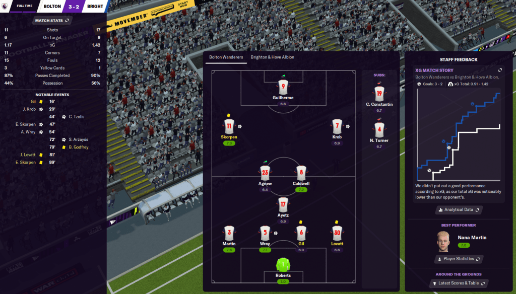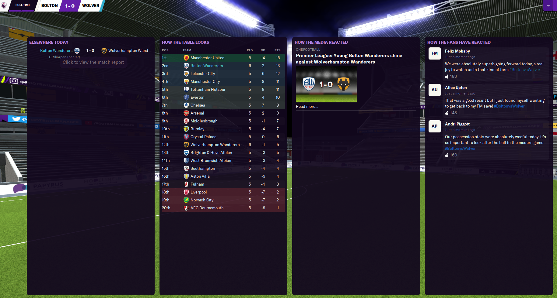 The strong home form continued against Bournemouth. Skorpen won and missed a penalty but we stayed on the front foot and Suraka scored his first Premier League goal on 36 minutes. We were easily the better team and eventually sealed the win as Guilherme came off the bench for his first top tier goal. Another home game followed as Wolves came to town and this time Suraka won a penalty that Skorpen converted on 17 minutes. We dominated and Wolves only had one shot in the first half, livened up after it but a player of the match performance (eight saves, 7.6 rating) by goalkeeper David Roberts won us another home match! That was the Friday night game and shot us up to second in the Premier League!! (But four of our six games have been at home, so that will obviously change quickly.)