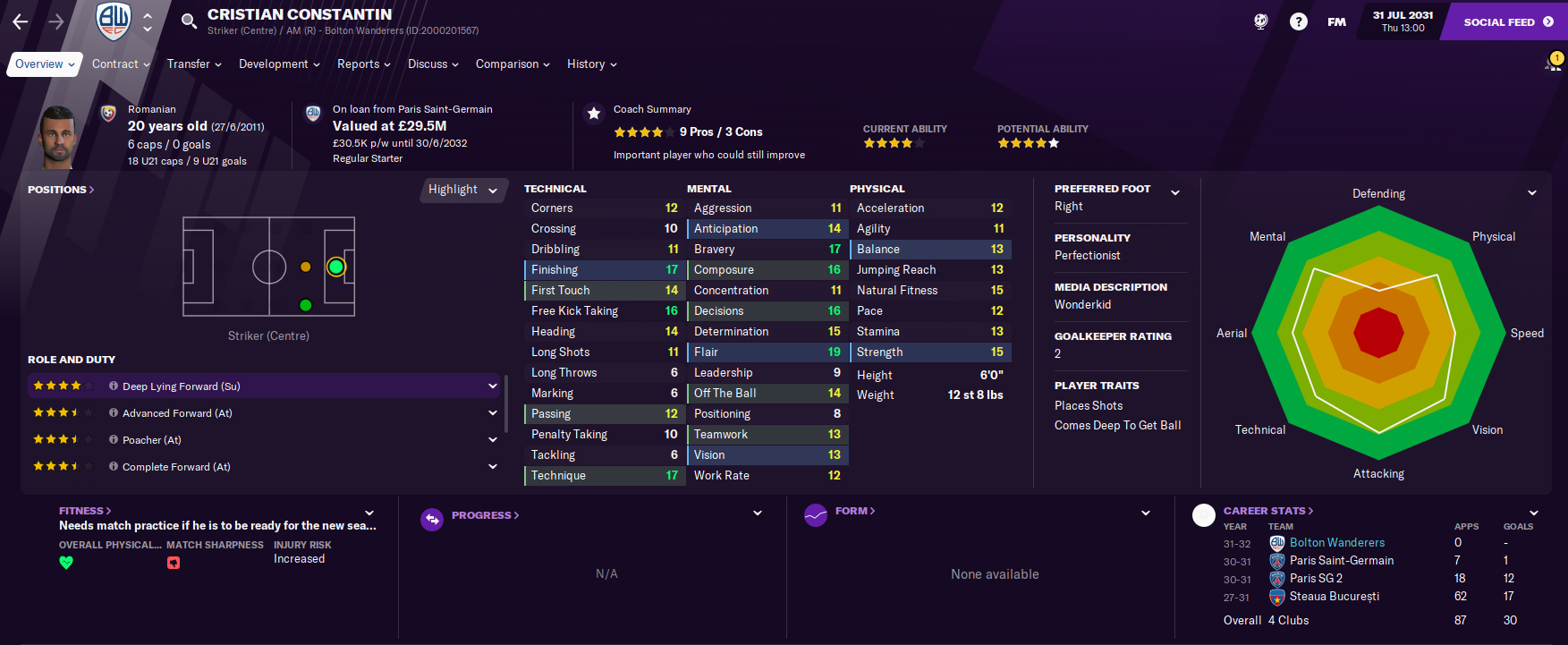The summer began by turning the loan of centre-back Gil into a permanent move. The 21-year-old signed for £7.5 million, which is by far and away the most we’ve spent on any player so far. I’d decided to switch back to a 4-3-3 with a holding midfielder for the step up to this level, so loaned in a step-up in quality in defensive midfield in Leicester’s Sergio Ayetz. George Iordache joined Lazio and Everton refused to do a deal for Shemar Vanzie, so we renewed a loan deal for Arsenal midfielder Jack Shaw. And we bolstered our attack by loaning PSG wonderkid Cristian Constantin, who cost the French side £6.25 million 12 months ago.
