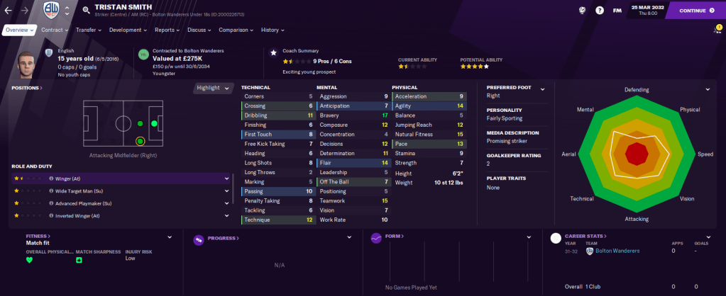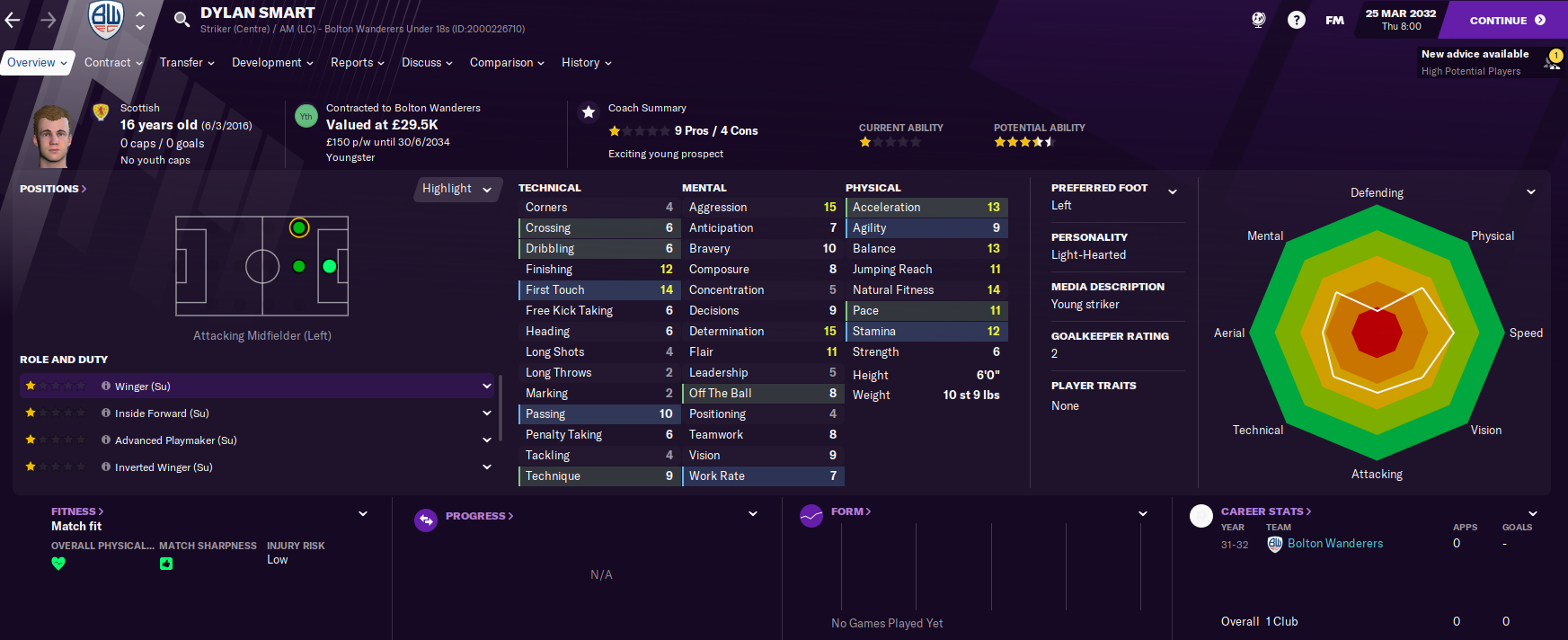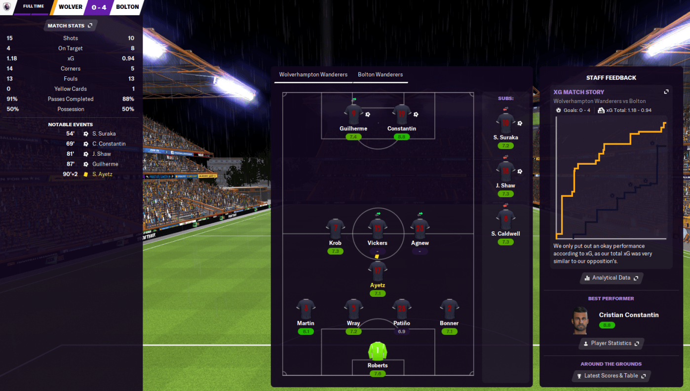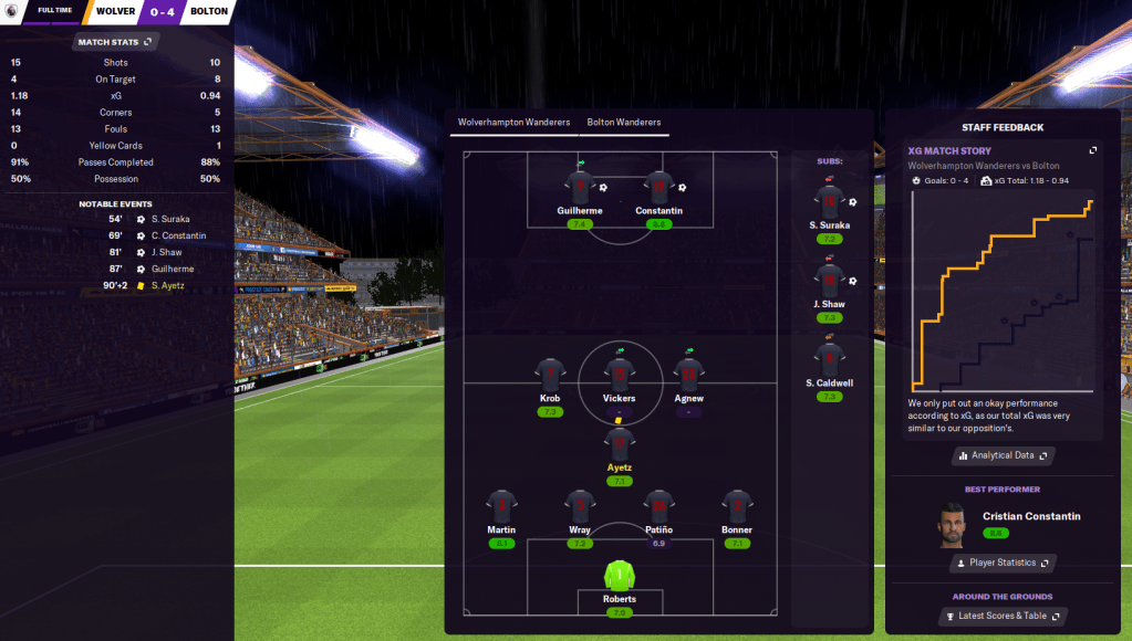 Two more away days – that’s four in a row – began with playing terribly and losing 2-0 at bottom of the league Bournemouth. Then my 600th match in charge of Bolton saw a massive response in our best away performance yet at Wolves, who were also in the relegation zone. A dull first half was instantly forgotten as Constantin teed up Suraka for a goal on the counter. The Romanian then scored himself and created another for Shaw – who won January young player of the month – before substitute Guilherme wrapped up a fantastic 4-0 win.
