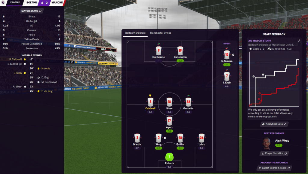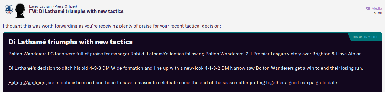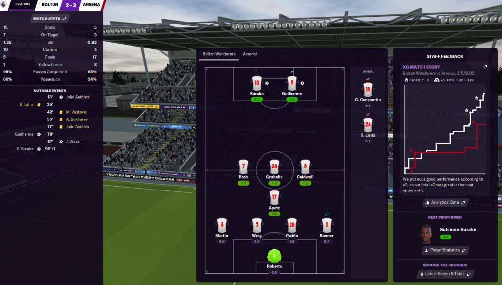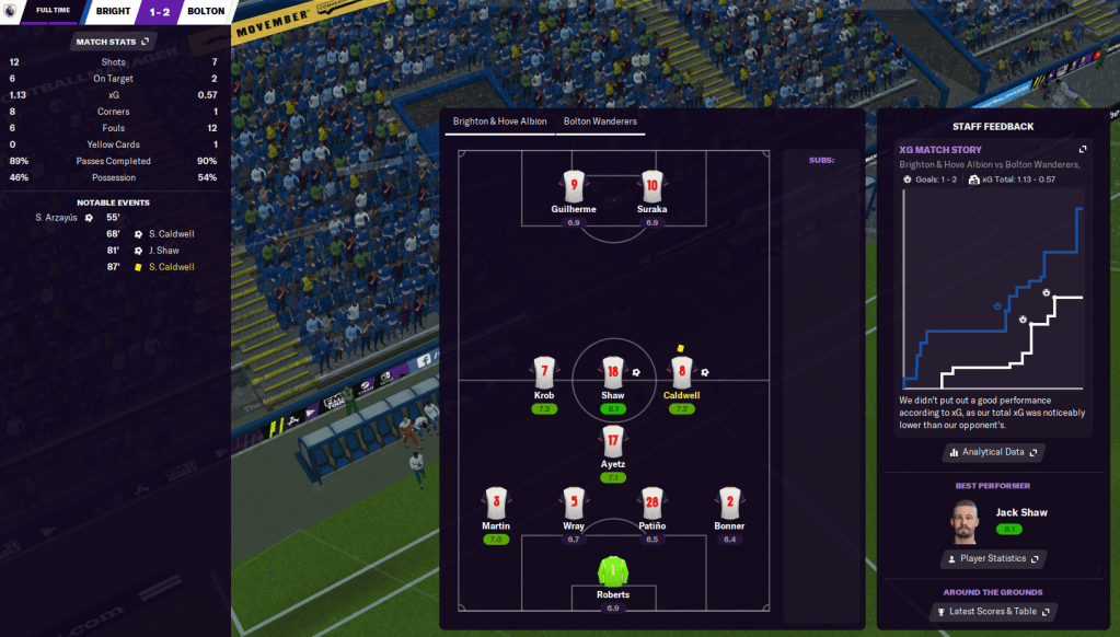 The Skorpen deal left us without a left-winger and I couldn’t find a decent replacement. So I decided to change the formation to a narrow 4-1-3-2 that packed out the midfield and moved Suraka up front. The first trial of this saw it work a treat at Brighton. We stifled them in a quiet first half, fell behind just after the break, but two lovely team goals saw us fire back and win with goals from Caldwell and Jack Shaw. And the Bolton fans loved our new tactical approach.