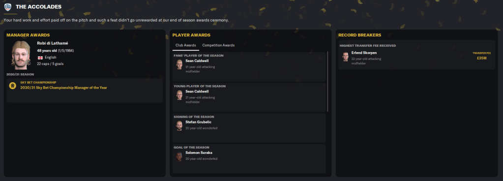 The transfer window began with Wuhan Zall making a £15 million bid for Erlend Skorpen, the left-winger we’d signed on a free transfer in 2029. He’d scored four goals this season but his potential was dwindling, but he’s important to us. So I asked for £35 million thinking they’d balk at it but they offered it! So yet another huge new transfer record sale came in. That boosted the bank balance to £95 million and, on top of the sale, we’re actually starting to make a profit every month for the first time thanks to TV revenue.