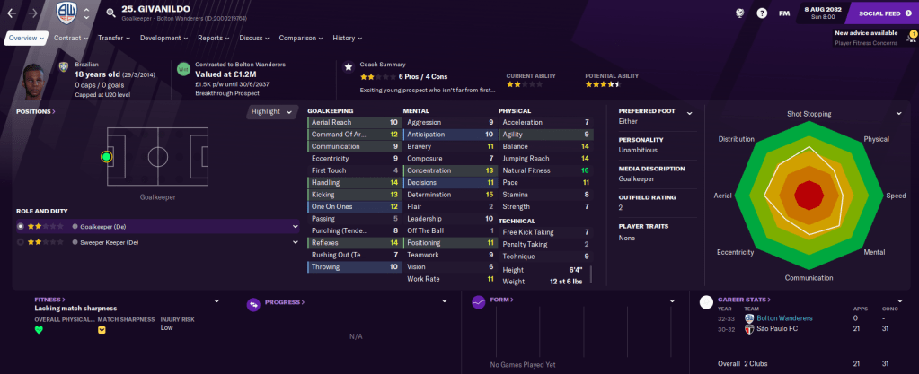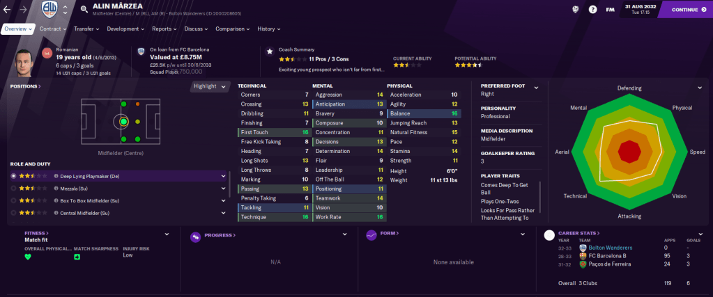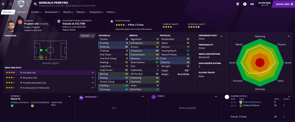 With Turner gone, it was time to strengthen the Bolton squad. That began with Uruguayan wonderkid centre-back Gonzalo Pereyra, who joined for £7.5 million from Atletico Penarol. And we added to midfield by snapping up Mathias Hansen for just £4.5 million from FC Kobenhavn, and his value has already gone to £20 million. Then we brought in striker Vedran Stamenkovic, of whom I had a player of the same name with Valencia on FM20, on loan from Arsenal. We also brought in a couple of backup youngsters and added to the Brazilian clan at the club in centre-back Éder Luís and goalkeeper Givanildo, then loaned a backup left-back in Atalanta’s Serkan Pala and midfielder in Barcelona’s Alin Marzea.
