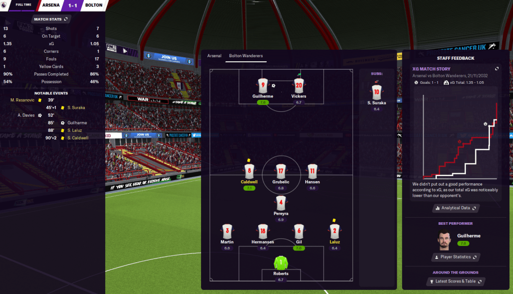 That was followed by one of the craziest games I’ve ever seen on Football Manager. We managed to take the lead at home to Chelsea as Jack Fleming scored an own goal from a corner after four minutes but he equalised 11 minutes later. Pereyra scored his first Bolton goal to send us into half-time ahead before Suraka and Guilherme scored two goals in a minute after the break. But then things went wild as Chelsea scored four goals in eight minutes to lead 5-4. We went attacking and academy product utility player Neal Vickers (think the new Paul Warhurst) was sent through on goal and fired home to equalise with his first senior goal. Guilherme even had a huge chance to nick it but, ridiculously, it ended Bolton 5-5 Chelsea!