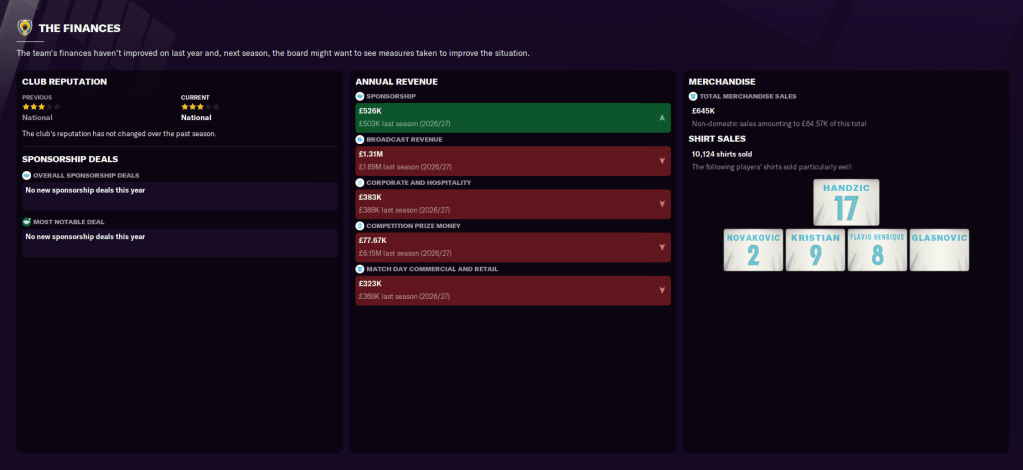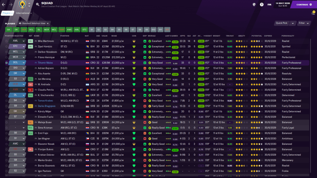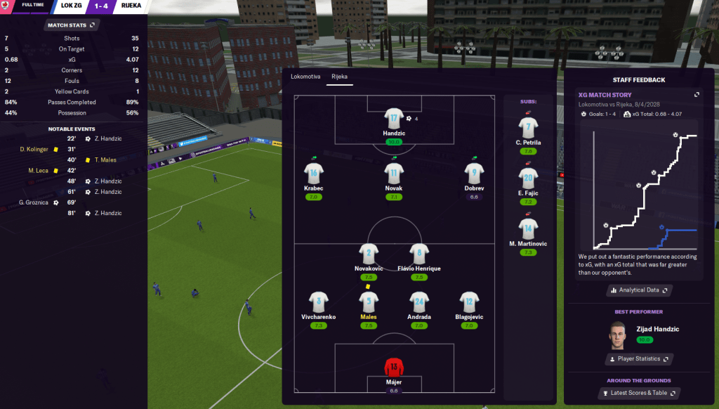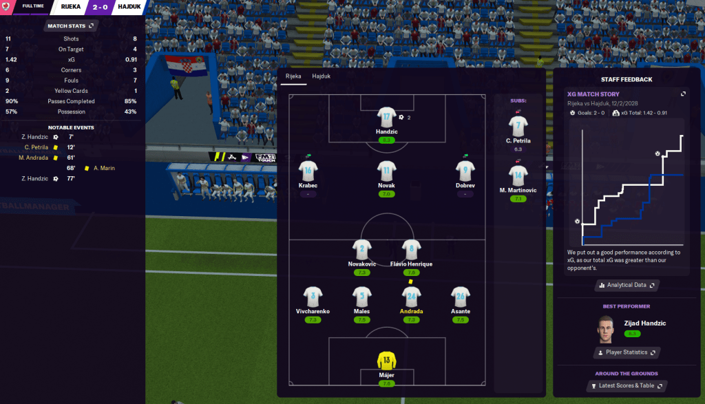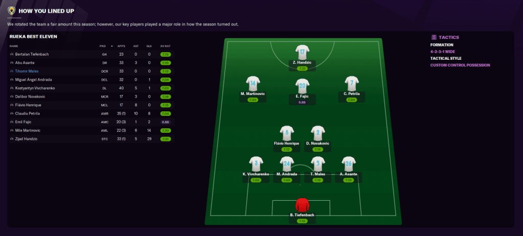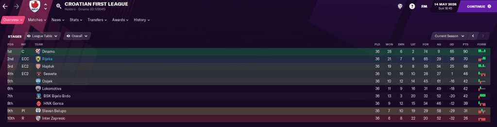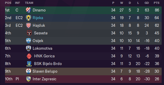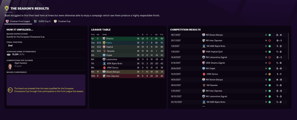 That ensured Rijeka sealed second place in the Croatian First League, which met the board’s expectation of Champions League qualification. Dinamo set the highest points tally during this save of 90 points, only two behind the all-time record they set in 2006/07, and extended their record of winning all but one title during this save.
