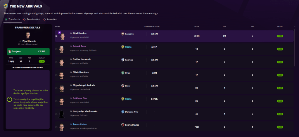 The star man this season has undoubtedly been Handzic who, after signing for £2.5 million in the summer, scored 29 and got five assists in 34 games in all competitions. He’s also become a wonderkid over the last couple of months. Martinovic was also impressive with 14 goals and six assists and had the highest average rating of 7.33. Petrila chipped in with eight goals and 10 assists, but no-one else scored more than three goals.