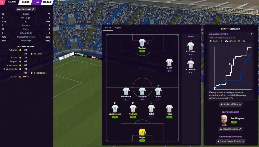 The second season began with a tough test at home to Dinamo, which saw Marin make his debut against his former club in the Adriatic Derby. However, Rijeka were without injured star striker Zijad Handzic and star midfielder Flávio Henrique, while Males and Stanojlovic were at the Olympics. A dire first-half was instantly forgotten as young right-back Zdenek Tesar put in a great cross for backup striker Jan Wagner to head home from two yards out 30 seconds into the second half. Hajduk offered nothing until their striker looked to be through on goal in the 93rd minute only for Diaz to cynically bring him down and receive a second yellow card. But Rijeka held on for a big opening day win.