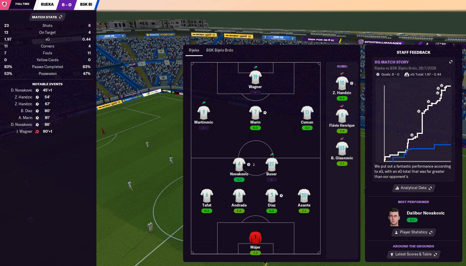 Another clean sheet followed at Gorica, but Rijeka also failed to score from their 16 shots at goal. Midfielder Dalibor Novakovic got his first Rijeka goal to open the scoring against Bijelo Brdo, before Handzic scored twice on his return from injury, Diaz and Marin also got their first goals for the club before Novakovic doubled his tally to seal a 6-0 rout.