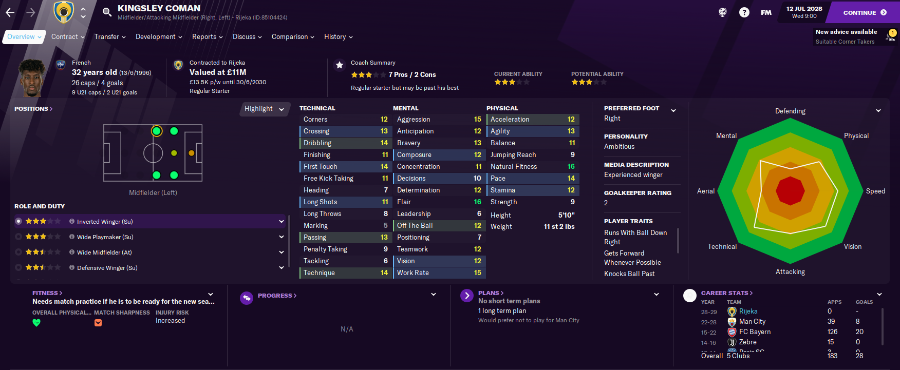 That meant there was plenty of spare cash to play with. So Latunov took a gamble on breaking the club’s transfer record to sign a star player from a rival club in winger Antonio Marin – a star of the Atalanta Avventure series on FM19 – for £6 million from Hajduk. He scored 11 league goals last season and offers a huge step up in quality. The same goes for Kingsley Coman, who was available on a free after leaving Man City and only wanted £13,500-a-week, which rings alarm bells but he certainly still has quality.